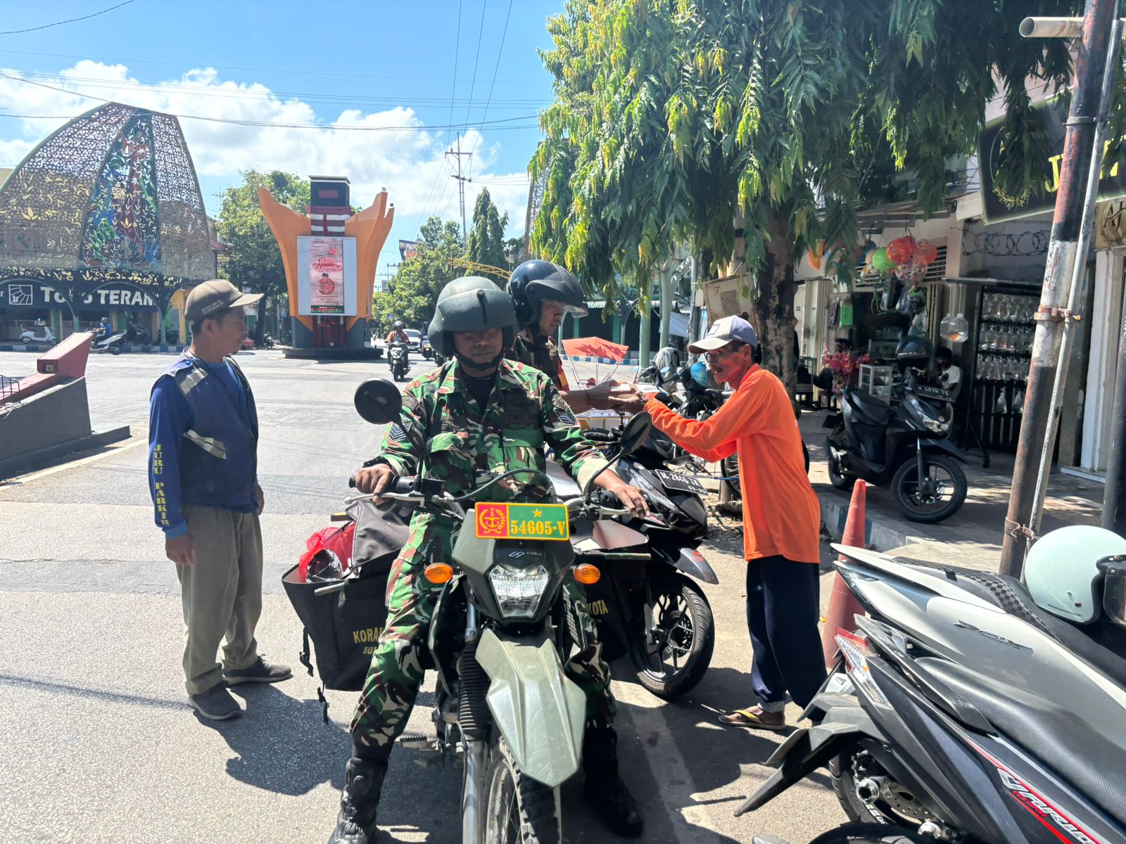 Dengan mengendarai sepeda motor, para Babinsa menelusuri jalan-jalan di wilayah kota untuk membagikan nasi kotak secara humanis kepada para penerima.