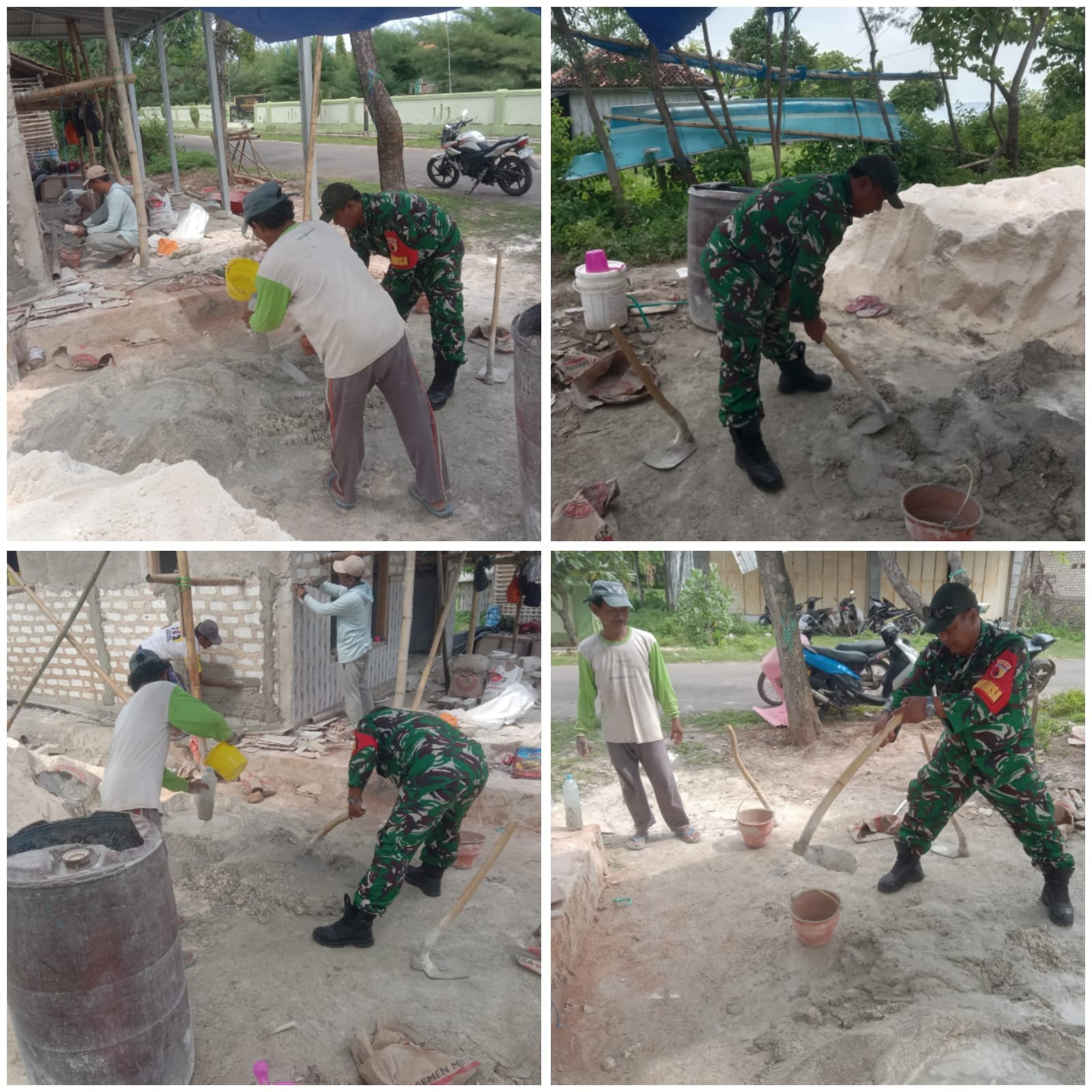 SUMENEP– Babinsa Koramil 0827/20 Sapudi Serda Sulikin melaksanakan kegiatan karya bakti dengan membantu warga mengaduk campuran semen dan pasir untuk pembangunan rumah milik warga di Desa Tanah Merah, Kecamatan Nonggunong, Kabupaten Sumenep, Rabu (24/12/2025).