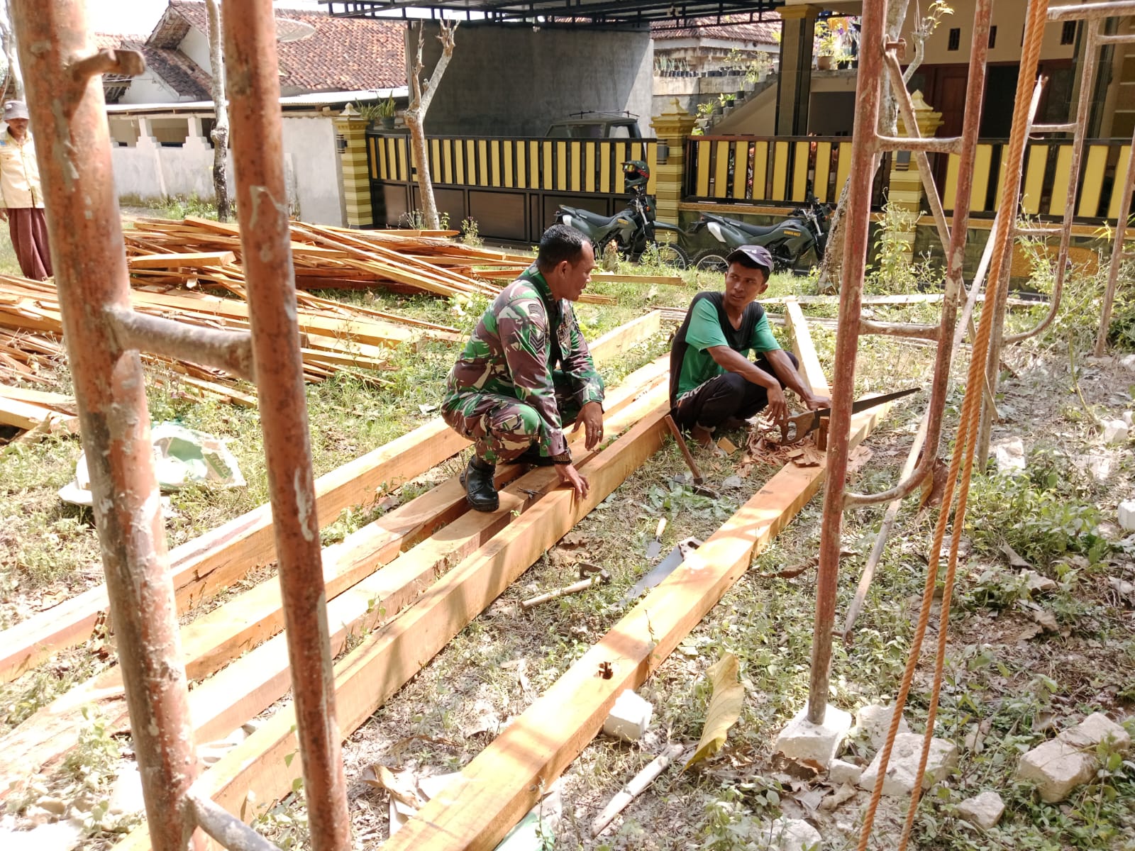 Dengan penuh semangat, Serka Moh. Patis terjun langsung ke lokasi dan membantu warga memastikan kualitas kayu yang digunakan cukup kuat dan layak untuk rangka atap. Ia juga turut membantu mengangkat dan menata kayu agar pekerjaan lebih cepat terselesaikan.