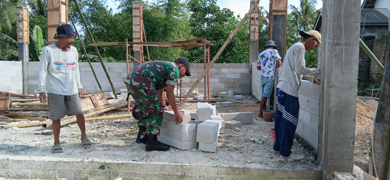 SUMENEP – Babinsa Koramil 14/Batang Batang Kodim 0827/Sumenep Kopda Andi Baso melaksanakan karya bakti membantu warga binaan angkat bata ringan di Desa Nyabakan Barat Kecamatan Batang Batang Kabupaten Sumenep, Sabtu (22/11/2025).