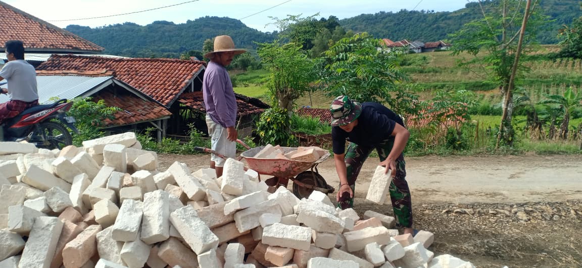 Pengangkutan batu putih untuk dinding rumah menjadi pekerjaan utama hari ini. Material tersebut dipindahkan secara manual oleh Praka Apriansyah bersama anggota Satgas lainnya, dibantu masyarakat sekitar, guna mempercepat proses pemasangan bata dan peninggian dinding.