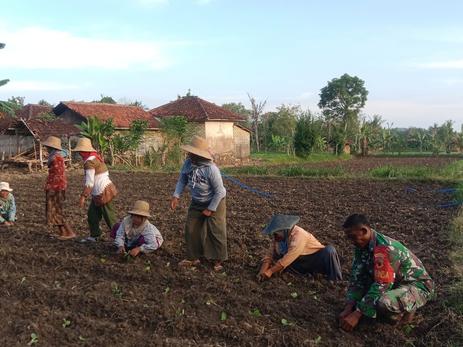 SUMENEP – Babinsa Koramil 0827/15 Batuputih, Serka Sigit Sugianto, turut serta membantu petani menanam tembakau di Desa Batuputih Laok, Kecamatan Batuputih, Kabupaten Sumenep, Minggu (29/6/2025).
