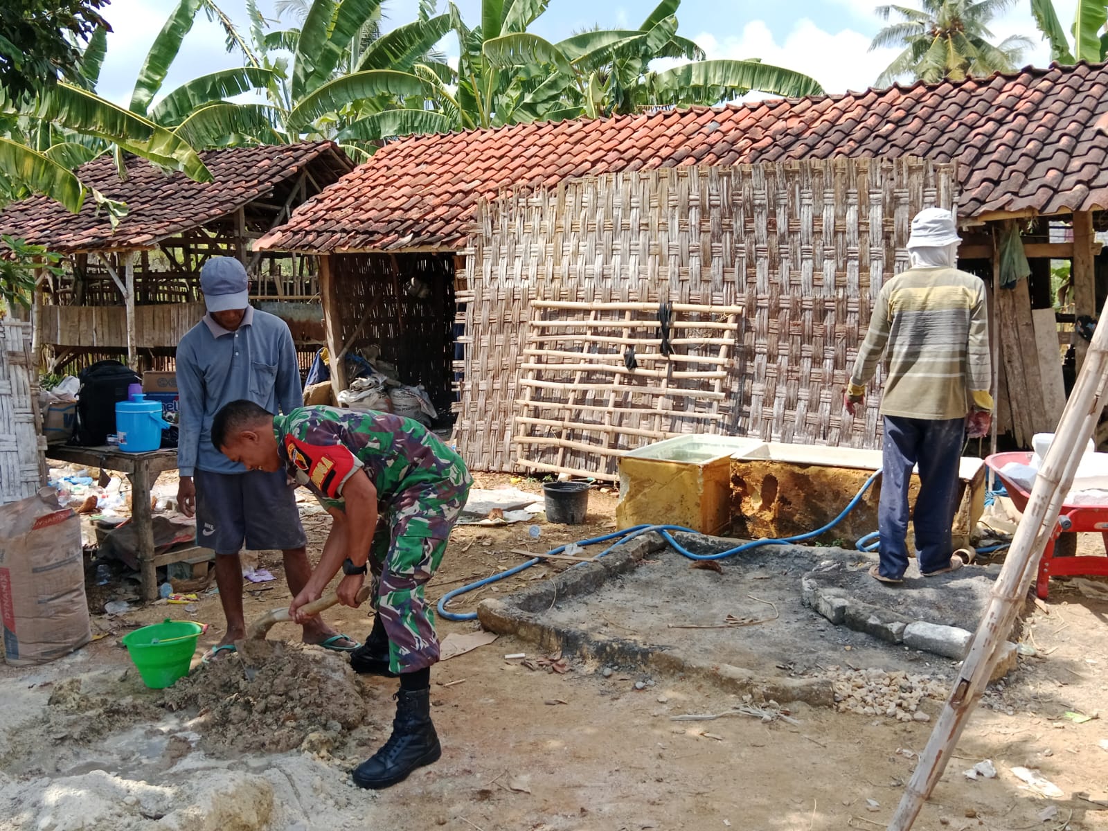 SUMENEP – Koptu Agus, Babinsa Koramil 0827/06 Saronggi, melaksanakan kegiatan Karya Bakti membantu pembangunan rumah milik warga binaannya di Desa Talang, Kecamatan Saronggi, Kabupaten Sumenep, Senin (23/6/2025).