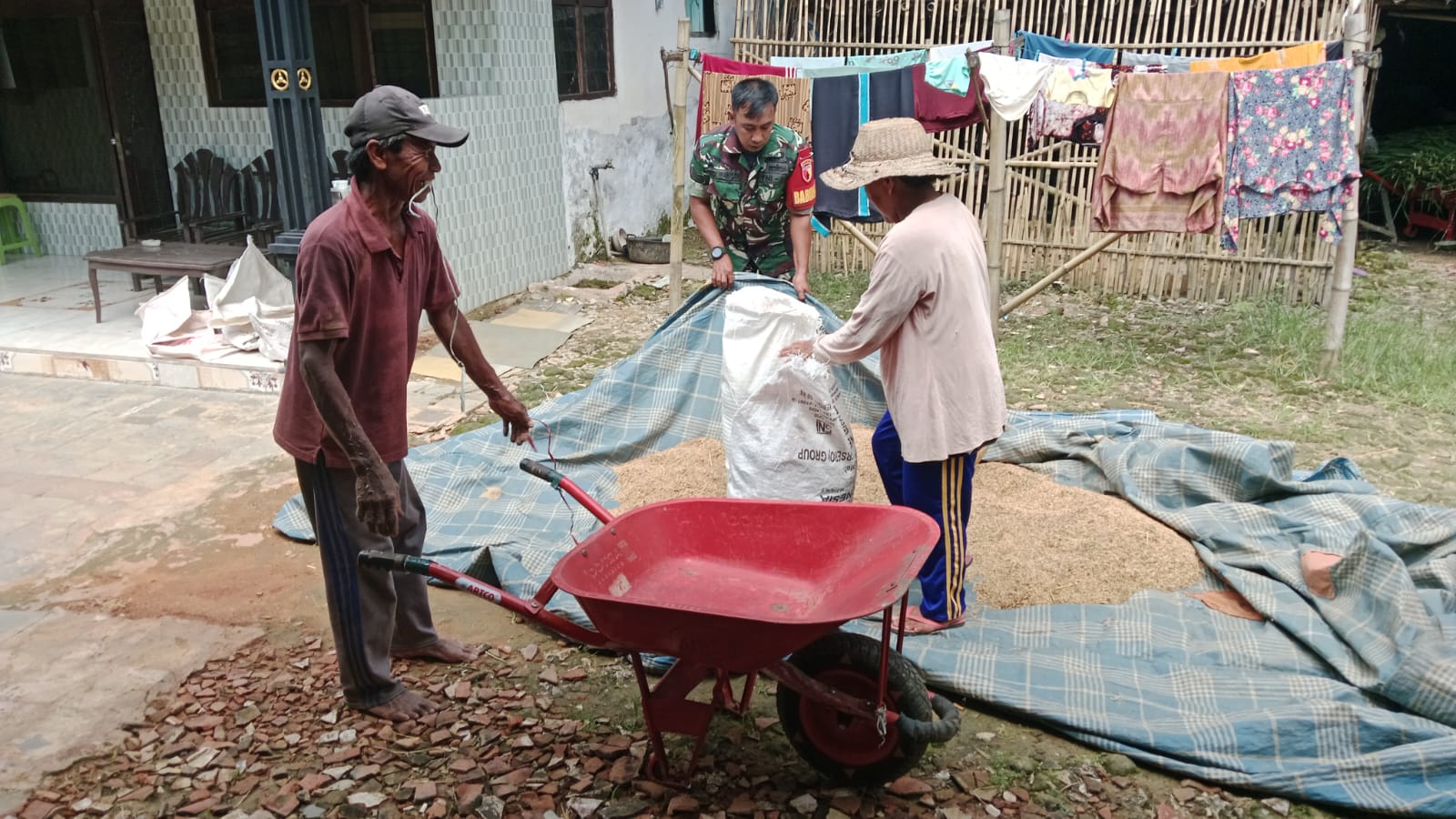 Kegiatan penjemuran ini dilakukan secara gotong royong oleh para petani dibantu Babinsa Koramil 0827/05 Lenteng Serka Dedi Wahyudi di halaman rumah yang terkena sinar matahari langsung.