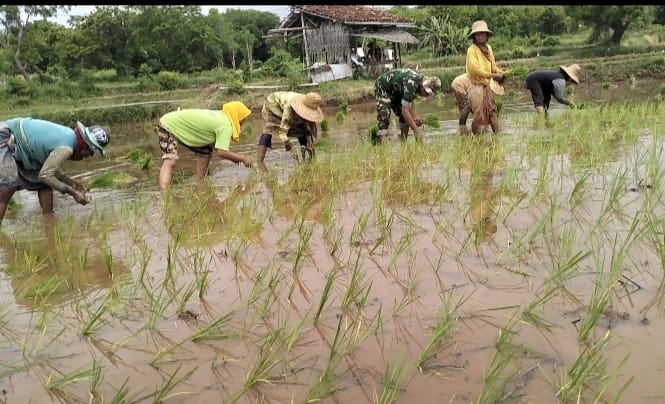 SUMENEP – Babinsa Koramil 15/Batuputih Kodim 0827/Sumenep, Koptu Ahmad Zaini, melaksanakan pendampingan kepada Kelompok Tani (Poktan) Sabilul Muttaqin dalam kegiatan tanam padi di lahan persawahan Desa Bantelan, Kecamatan Batuputih, Kabupaten Sumenep, Jum’at (4/7/2025).