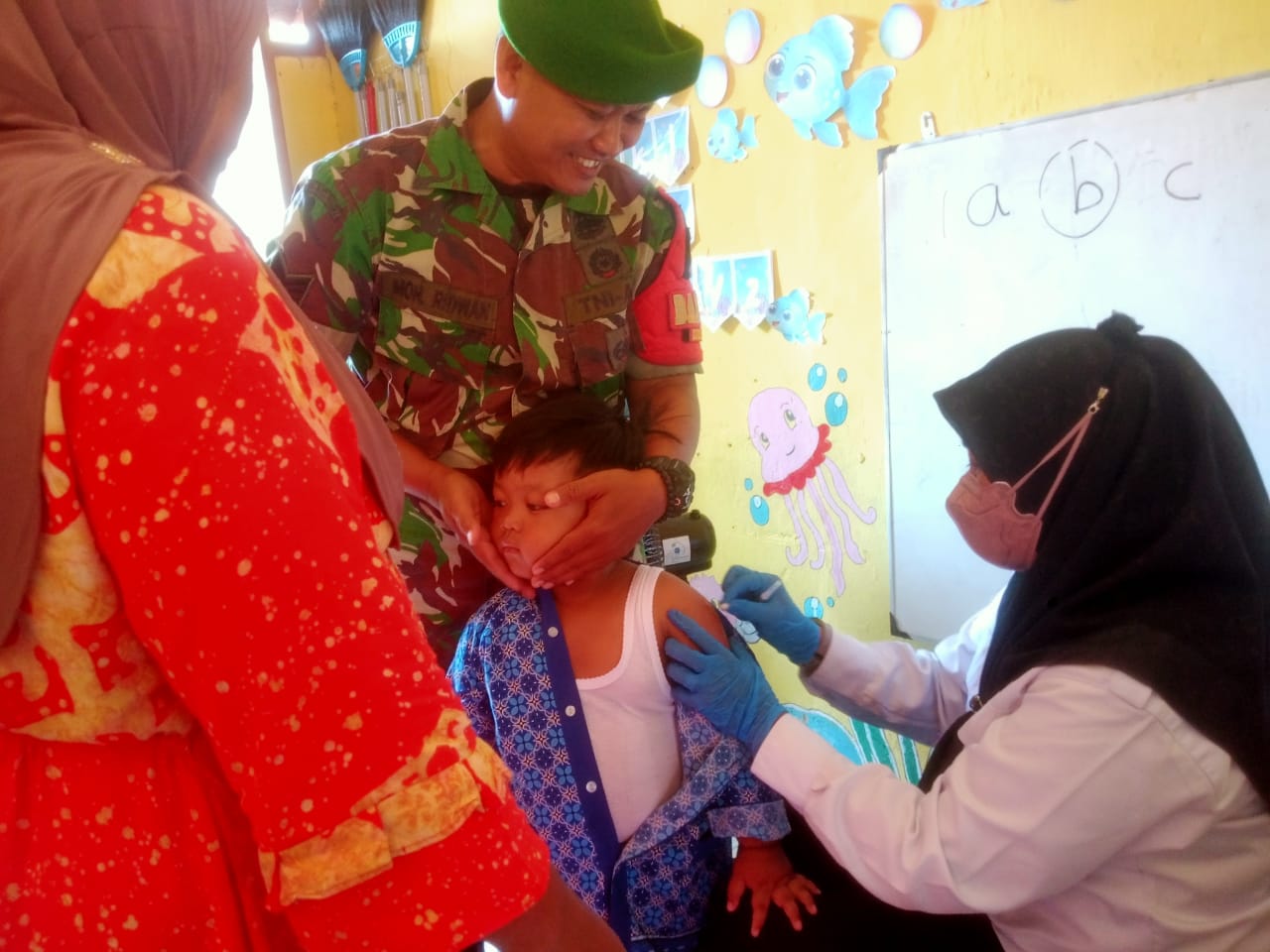 SUMENEP – Bentuk kepedulian terhadap kesehatan anak usia dini ditunjukkan oleh Babinsa Koramil 0827/02 Kalianget Serma Muhamad Ridwan dengan mendampingi pelaksanaan imunisasi campak di TK PGRI Kalianget Barat, Kecamatan Kalianget, Kabupaten Sumenep. Kamis (28/8/2025).