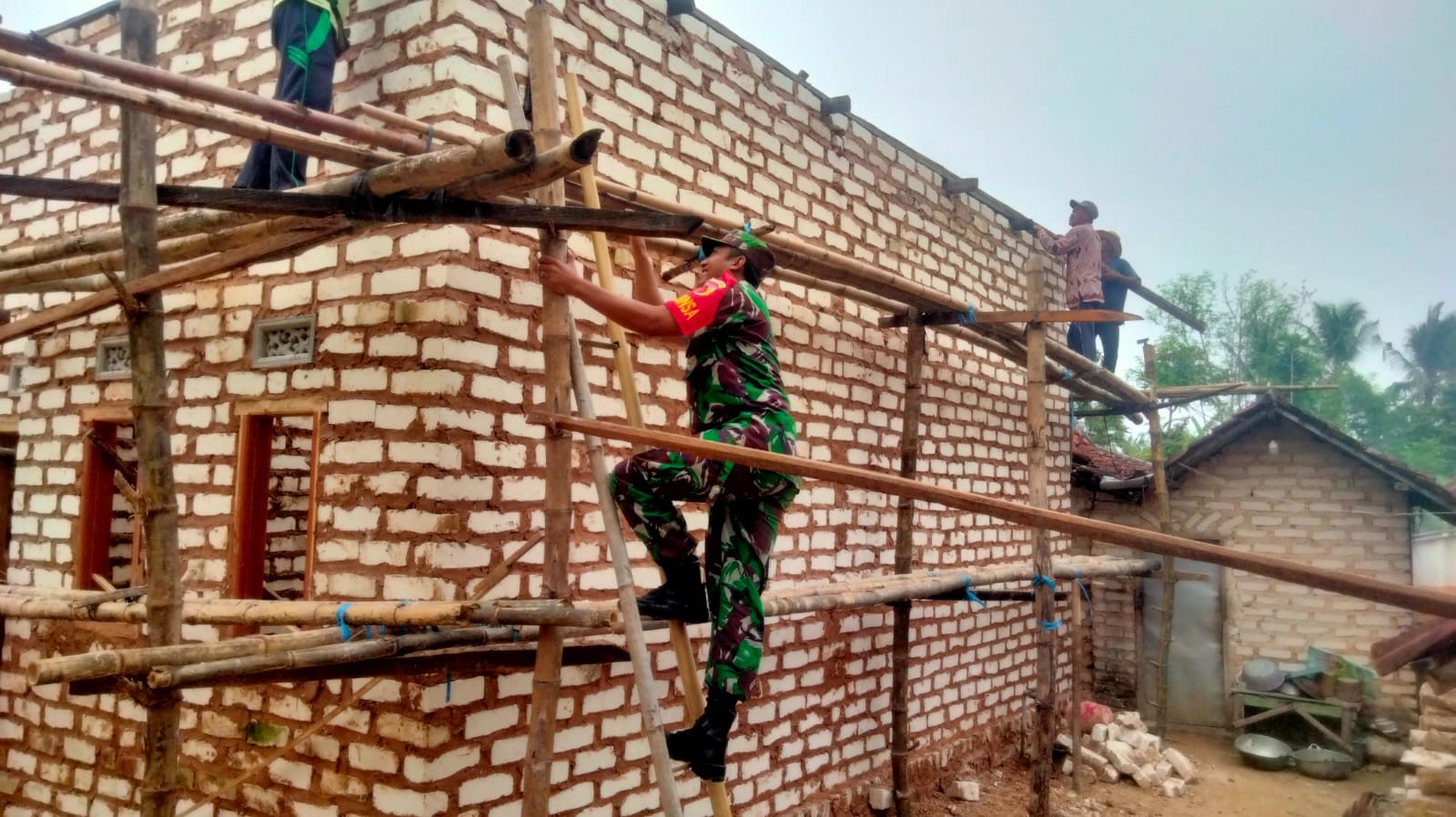 Sejak pagi, suasana cerah mewarnai jalannya kegiatan. Koptu Kanto Iswahyudi tampak sigap membantu warga mengangkat material dan menyusun rangka bangunan. Bahkan, di bawah terik matahari, ia turut naik ke atap untuk memasang rangka kayu bersama masyarakat.