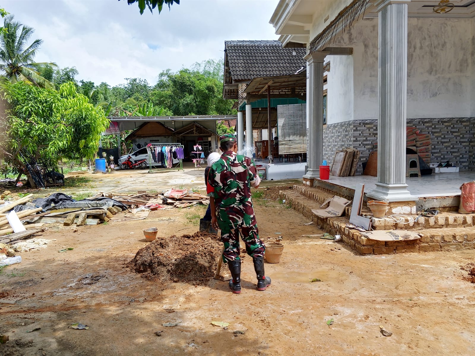 Kegiatan tersebut merupakan bagian dari karya bakti TNI yang rutin dilakukan guna mempererat hubungan antara aparat kewilayahan dengan masyarakat. Dalam kegiatan itu, Serka Rasul terlihat ikut mengaduk campuran tanah dan semen sebagai bahan dasar pemasangan keramik rumah milik Munir, salah satu warga setempat.