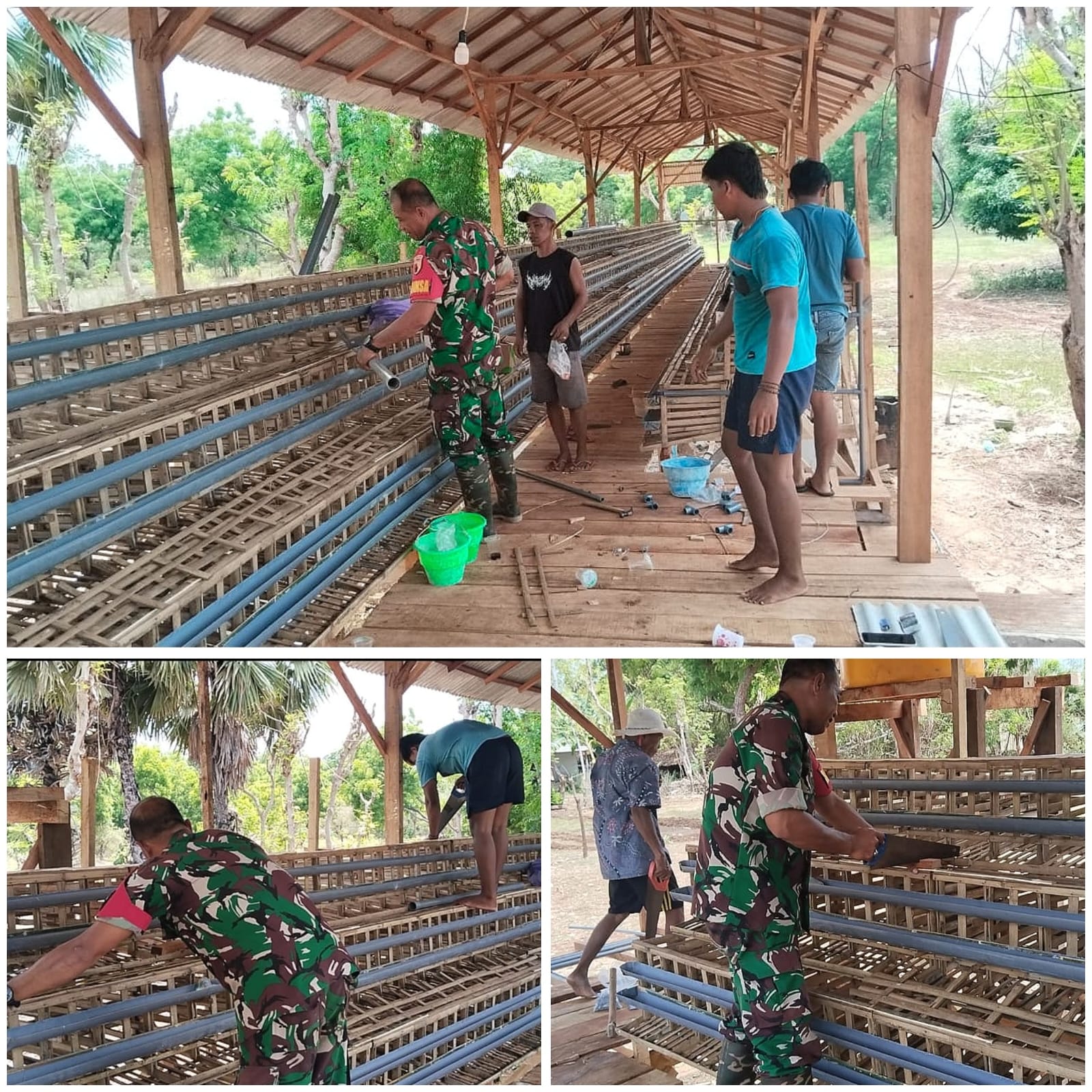 Sumenep – Babinsa Koramil 0827/23 Giligenting, Serda Imam Fauzi, turun langsung membantu warga membangun kandang ternak burung puyuh di Dusun Bundan Daja, Desa Galis, Kecamatan Giligenting, Kabupaten Sumenep, Kamis (13/11/2025).