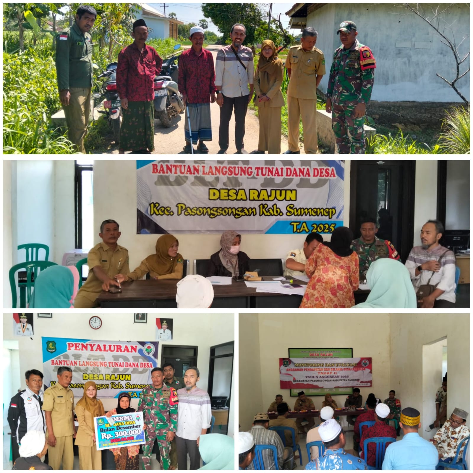 SUMENEP – Babinsa Koramil 0827/11 Pasongsongan mengawal pelaksanaan Monitoring dan Evaluasi (Monev) APBDes Tahap II Tahun 2025 yang dirangkai dengan penyaluran Bantuan Langsung Tunai Dana Desa (BLT-DD) Tahap IV di Balai Desa Rajun, Kecamatan Pasongsongan, Kabupaten Sumenep, Selasa (23/12/2025).