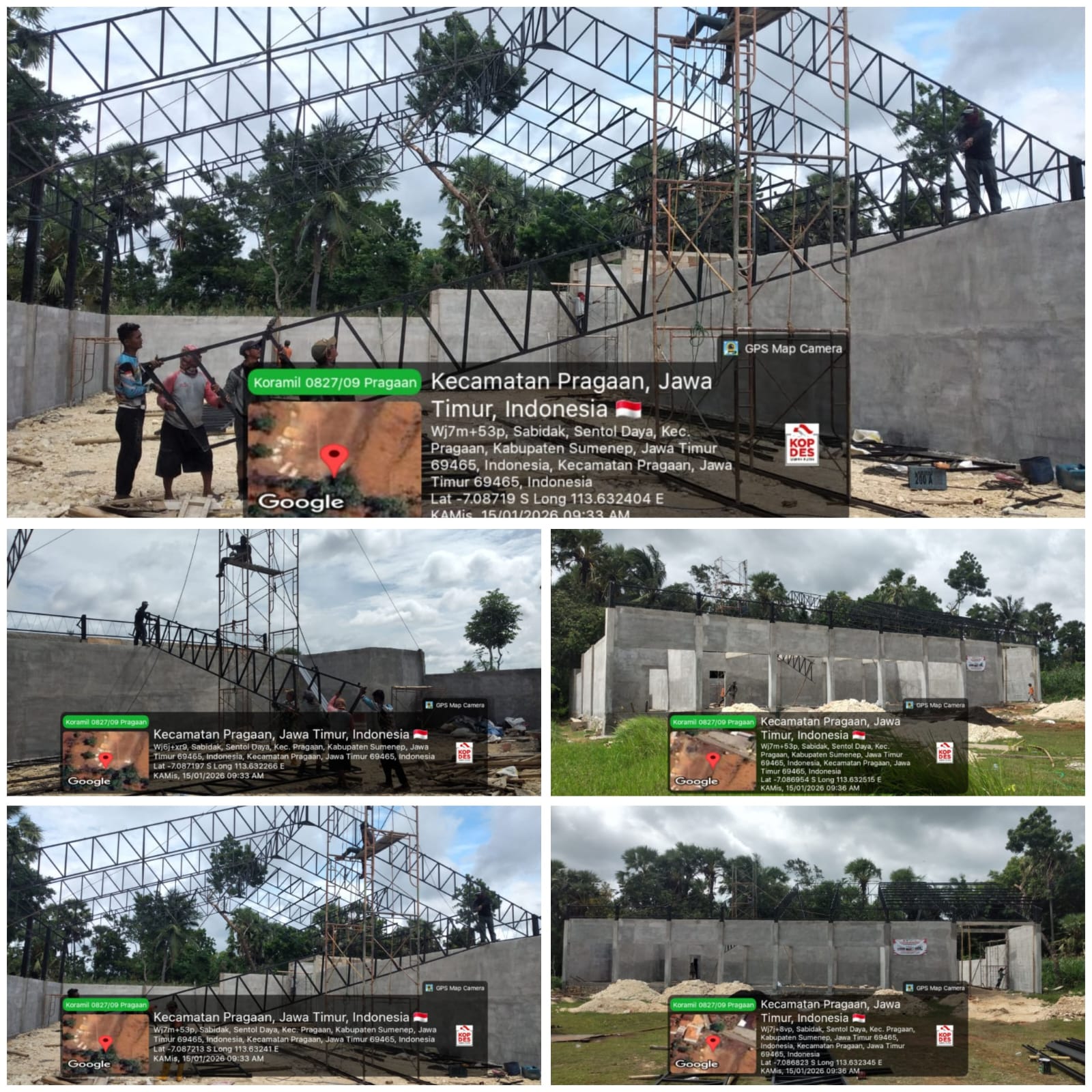 Sumenep – Progres pembangunan Koperasi Desa Merah Putih di Kecamatan Pragaan, Kabupaten Sumenep, terus berjalan. Saat ini, pengerjaan telah memasuki tahap pemasangan rangka atap baja sebagai bagian struktur utama bangunan, Kamis (15/1/2026).