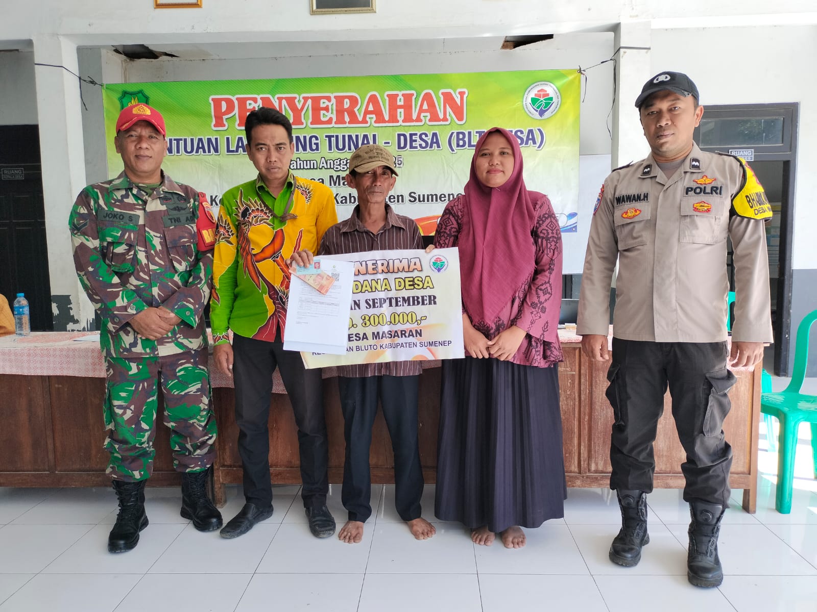 SUMENEP – Babinsa Koramil 04/Bluto, Serda Joko melaksanakan pendampingan kegiatan pembagian Bantuan Langsung Tunai (BLT) yang berlangsung di Kantor Desa Masaran, Kecamatan Bluto, Kabupaten Sumenep, pada Jumat (01/08/2025).