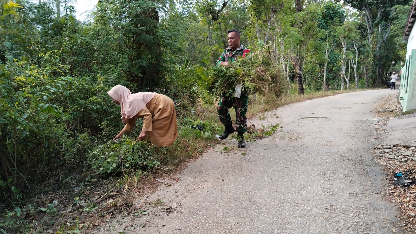 SUMENEP – Babinsa Koramil 0827/ 04 Bluto, Sertu M. Afik mengajak warga Desa Lubuk, Kecamatan Bluto, Kabupaten Sumenep, untuk bersama-sama membersihkan jalan desa. Kegiatan ini dilakukan sebagai upaya menjaga kebersihan lingkungan sekaligus mempererat silaturahmi antarwarga dan TNI di wilayah setempat. Sabtu (14/06/2025).