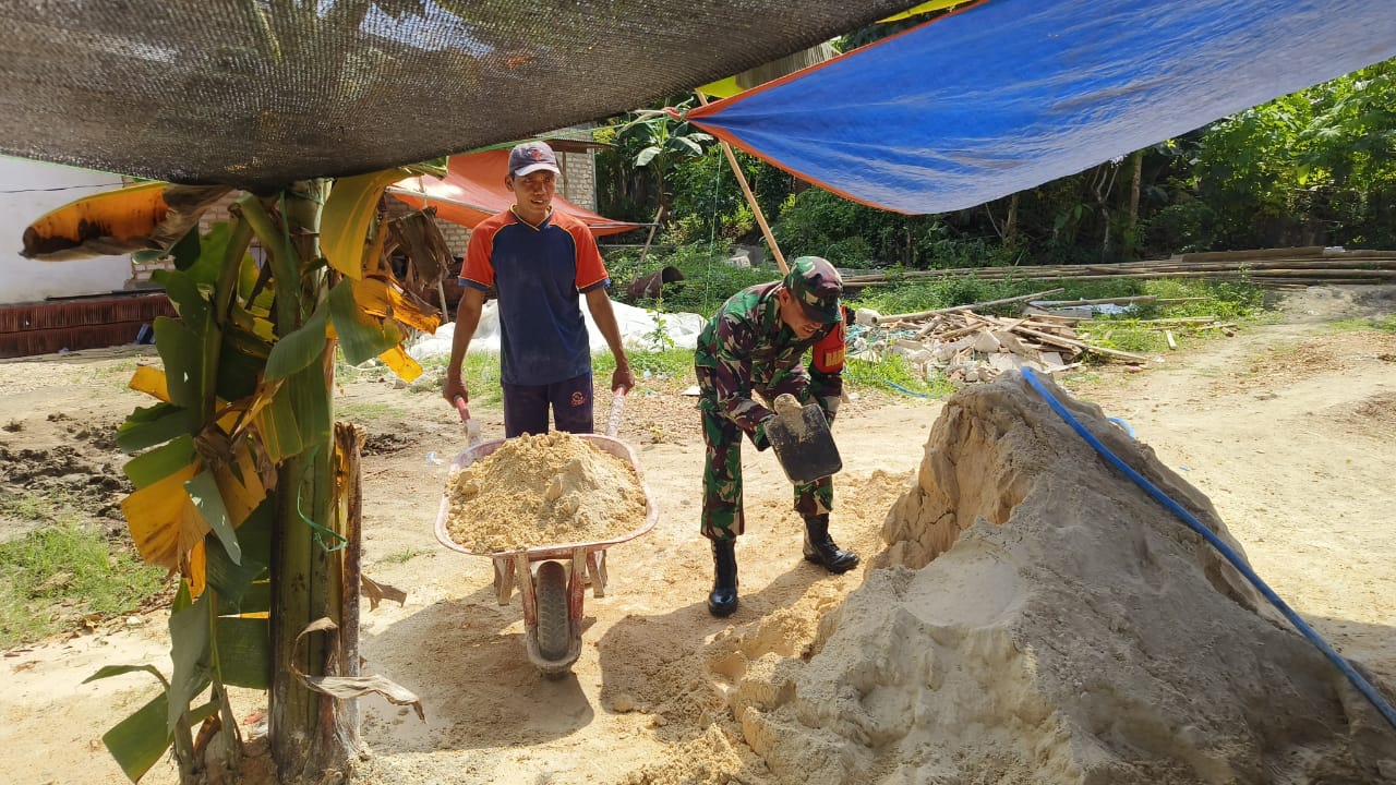 Dengan semangat kebersamaan dan tanpa ragu, Kopda Rifa’i turut serta mengaduk semen, mengangkat material bangunan, serta memberikan semangat kepada warga lainnya yang juga ikut bergotong royong. Aksi ini merupakan bagian dari upaya TNI dalam mempererat hubungan dengan masyarakat serta mewujudkan kemanunggalan TNI dan rakyat.