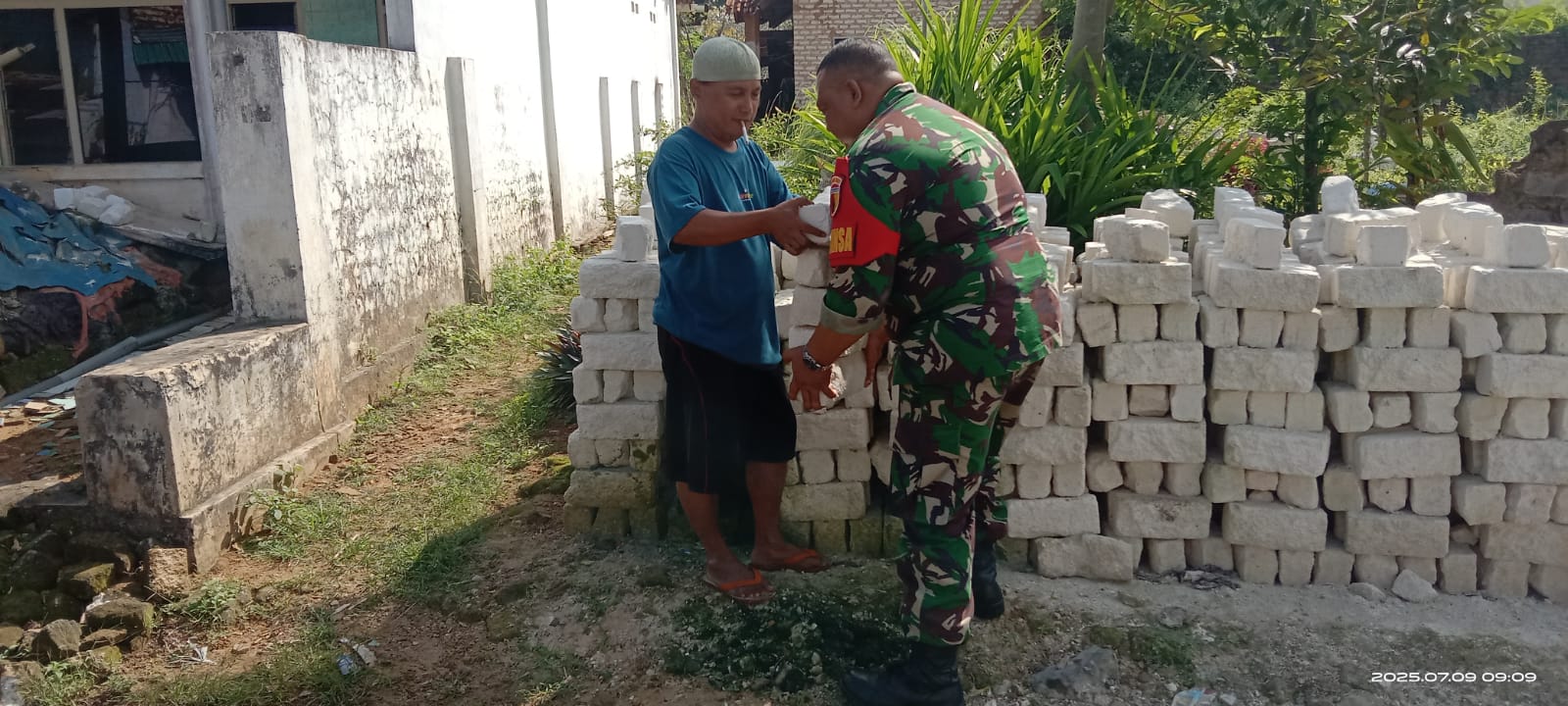 Dengan semangat kebersamaan dan kekeluargaan, Babinsa bersama masyarakat bahu membahu memindahkan material dari satu lokasi ke tempat pembangunan yang telah disiapkan.