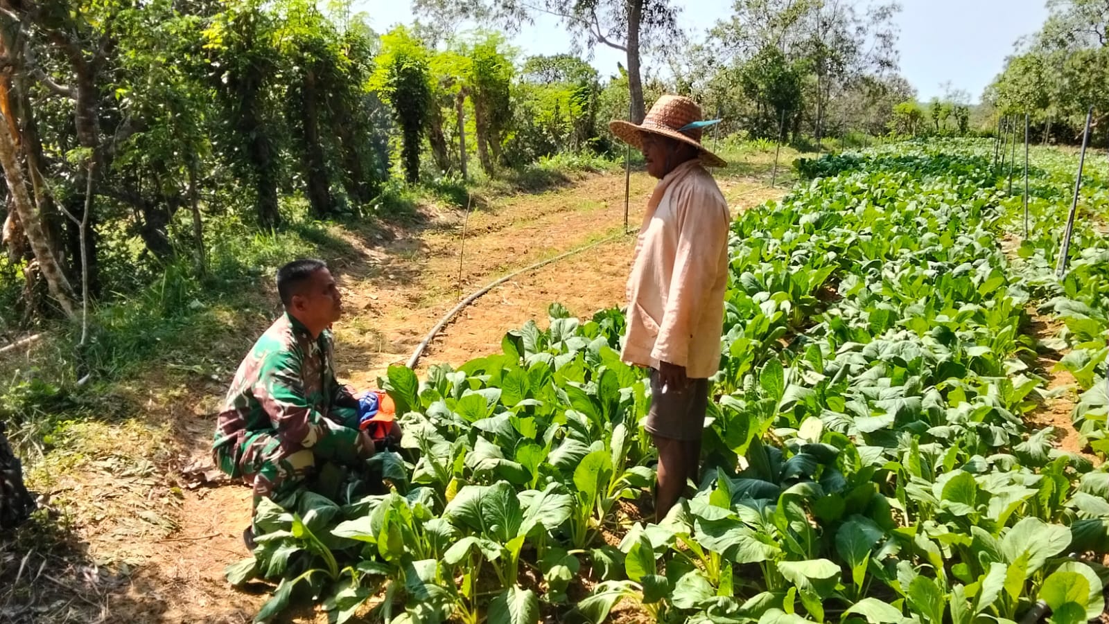 SUMENEP – Sebagai bentuk kepedulian terhadap ketahanan pangan dan dukungan kepada para petani di wilayah binaan, Babinsa Koramil 12/Dasuk Kodim 0827/Sumenep, Sertu Adiyono, melaksanakan pendampingan kepada petani dalam pengecekan hama pada tanaman sawi di Desa Kencer, Kecamatan Dasuk, Kabupaten Sumenep, pada Sabtu (27/09/2025).