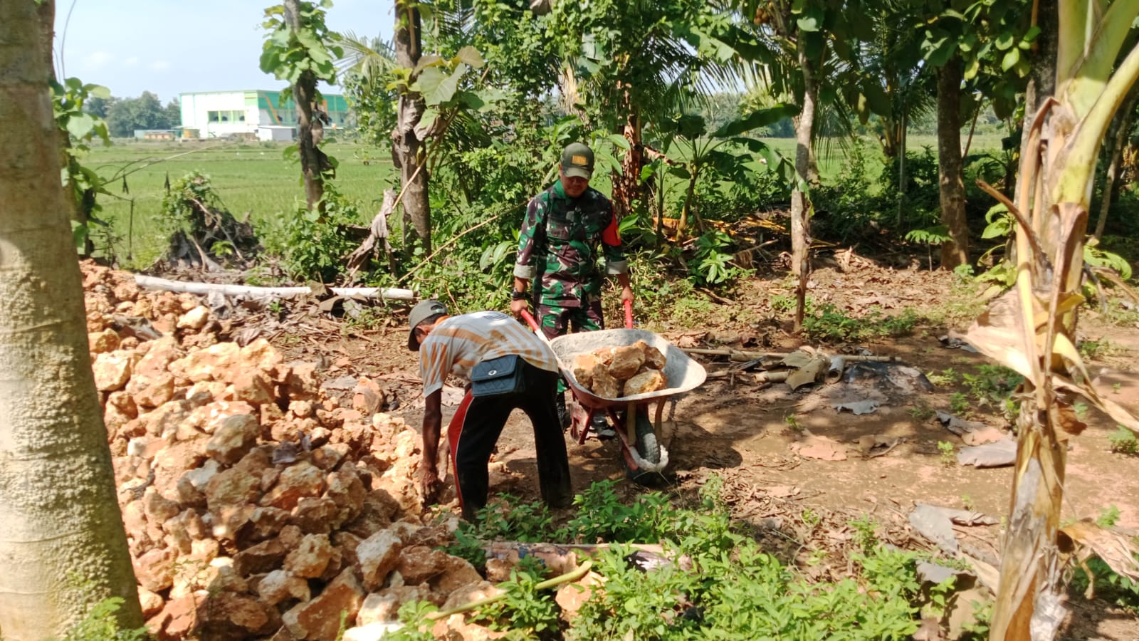 SUMENEP – Bintara Pembina Desa (Babinsa) Koramil 0827/16 Gapura, Serka Edi, turut serta membantu warga dalam kegiatan pemindahan batu untuk pembuatan parit di Desa Gapura Tengah Kecamatan Gapura Kabupaten Sumenep, Rabu (18/06/2025).