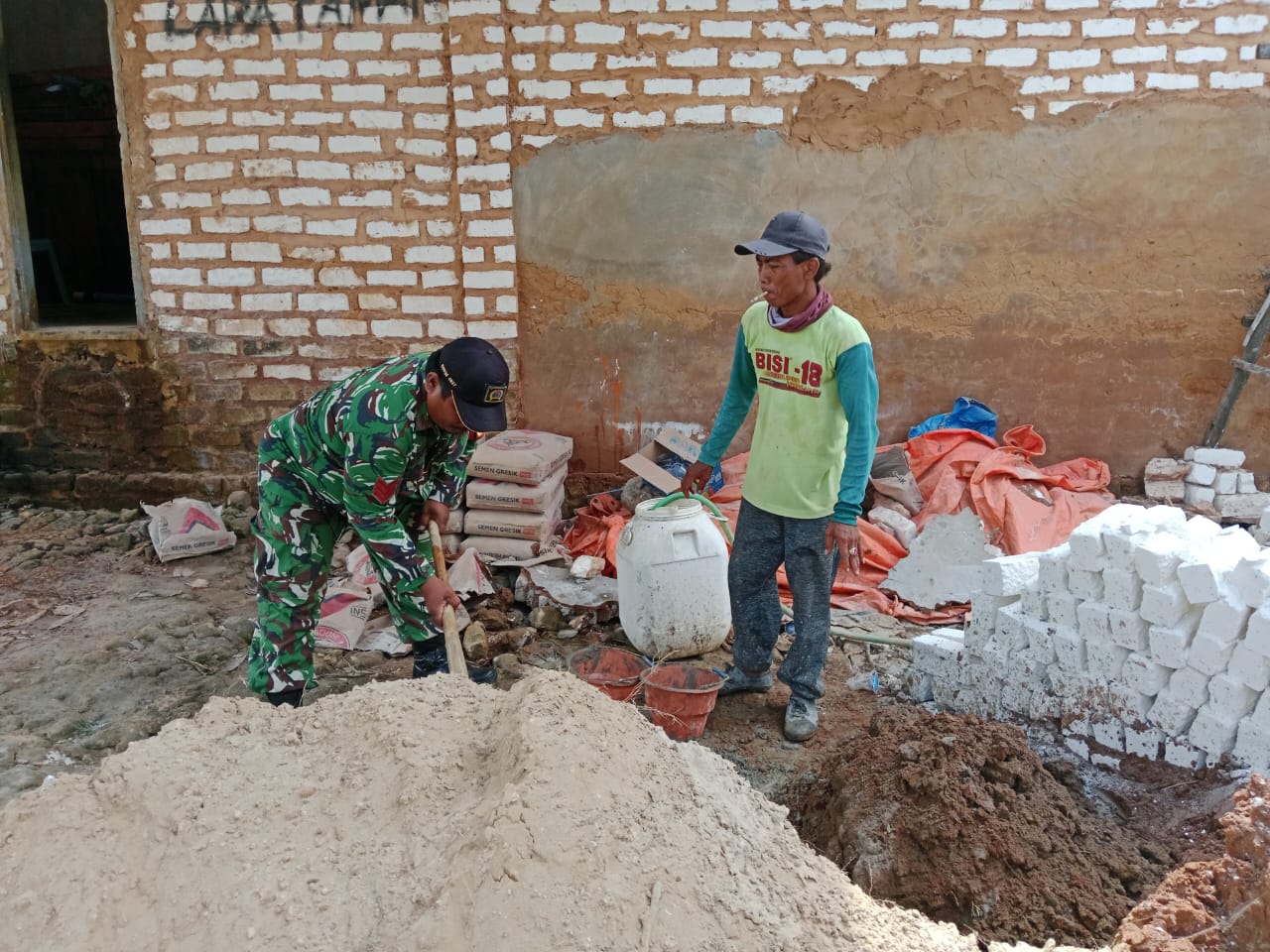 Dalam kegiatan tersebut, Kopka Hendri turut serta membuat adonan semen bersama warga sebagai bentuk gotong royong dan kebersamaan antara TNI dan masyarakat.