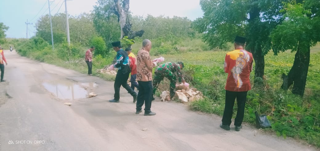 SUMENEP – Bentuk kepedulian terhadap kondisi infrastruktur di wilayah binaannya, Babinsa Koramil 21/Raas Kodim 0827/Sumenep, Serka Hartono, bersama warga melaksanakan kegiatan gotong royong menimbun jalan berlubang di Desa Karang Nangka Kecamatan Raas Kabupaten Sumenep, pada Sabtu (5/7/2025).