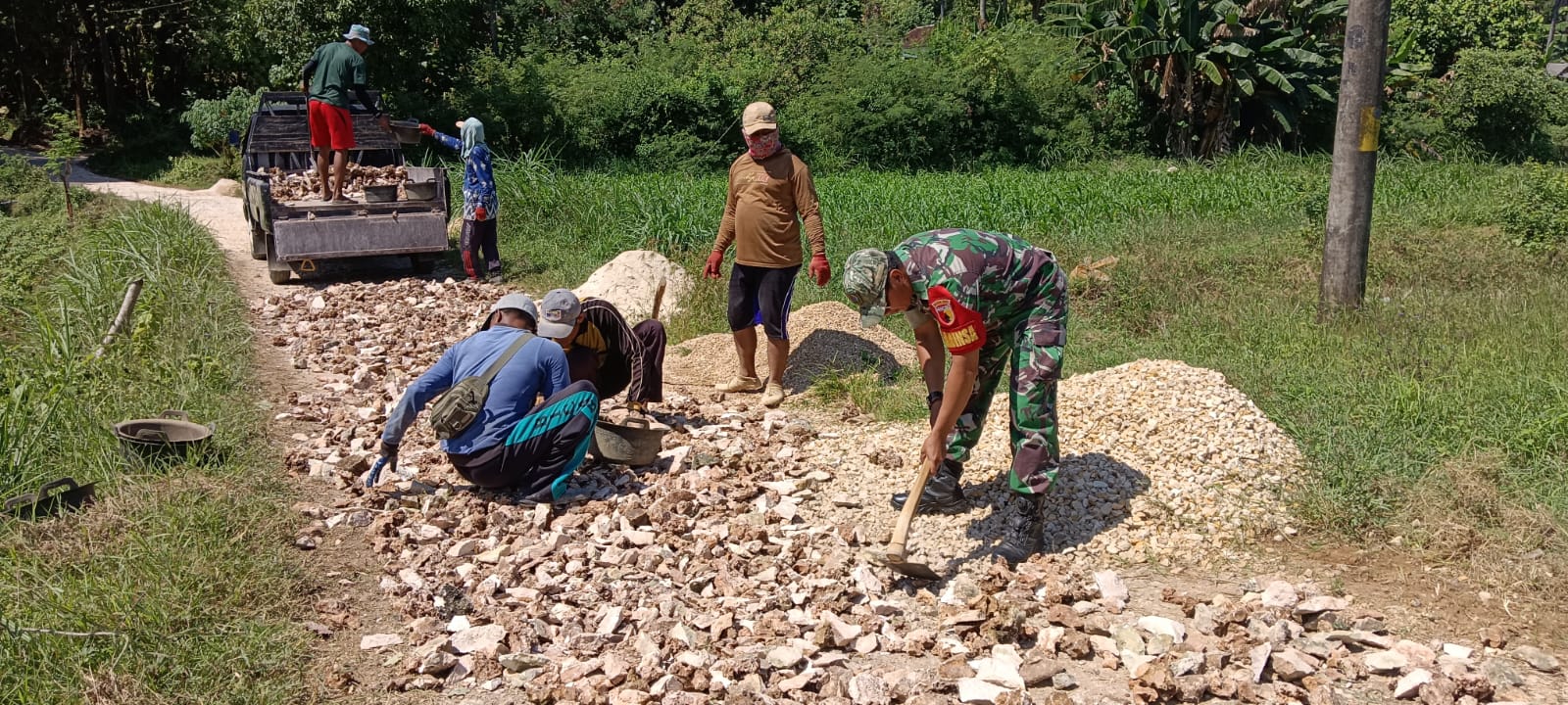SUMENEP – Babinsa Koramil 0827/15 Batuputih, Serka Guno Widagdo, turut ambil bagian dalam kegiatan karya bakti pembangunan jalan lapen di Desa Sergang, Kecamatan Batuputih, Kabupaten Sumenep.