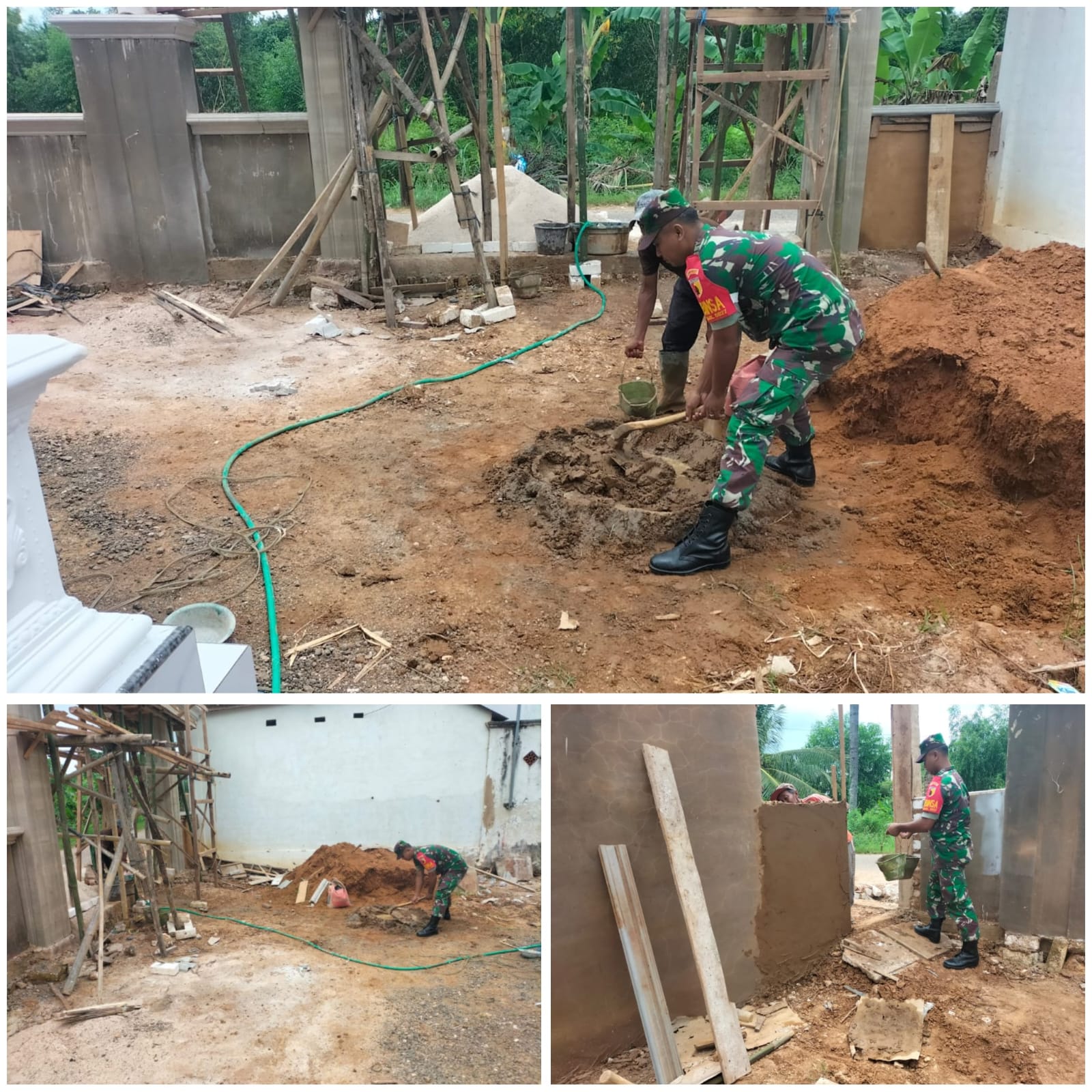Dalam kegiatan tersebut, Koptu Agus Supriyanto bersama warga setempat bahu-membahu mengaduk campuran tanah dan semen sebagai bahan utama pembangunan rumah milik Bapak Rudi, salah satu warga binaan di wilayah tersebut. Kegiatan ini berlangsung dengan penuh semangat kebersamaan dan gotong royong.