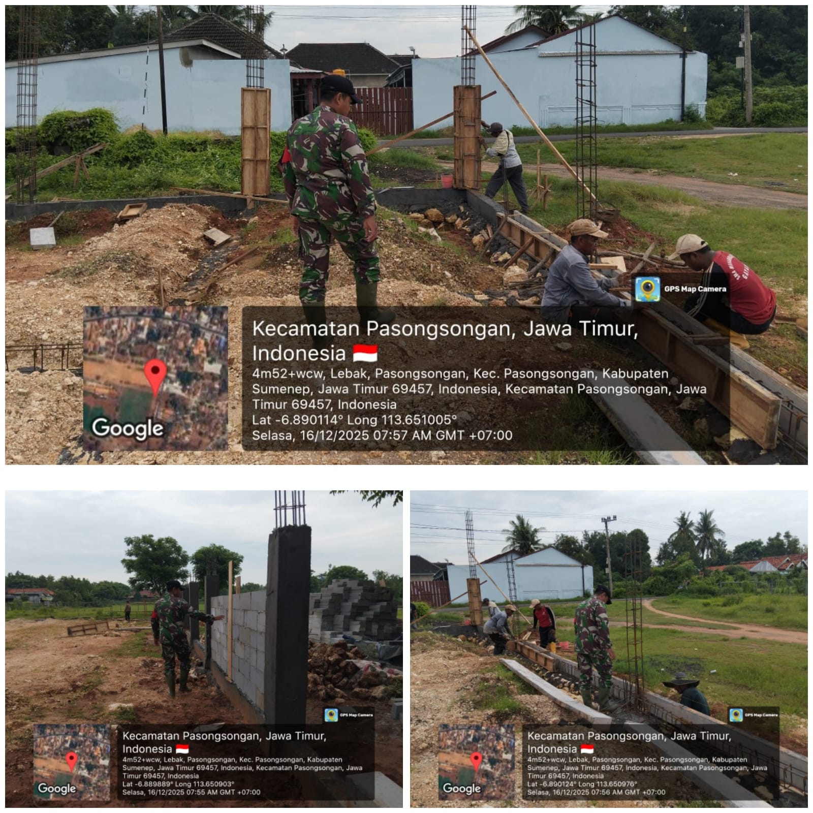 Untuk memastikan kualitas dan ketepatan pekerjaan, Babinsa Koramil 0827/11 Pasongsongan Kopda Domairi Efendi turun langsung melakukan pengawasan material dan progres pembangunan di lokasi, Selasa (16/12/2025).