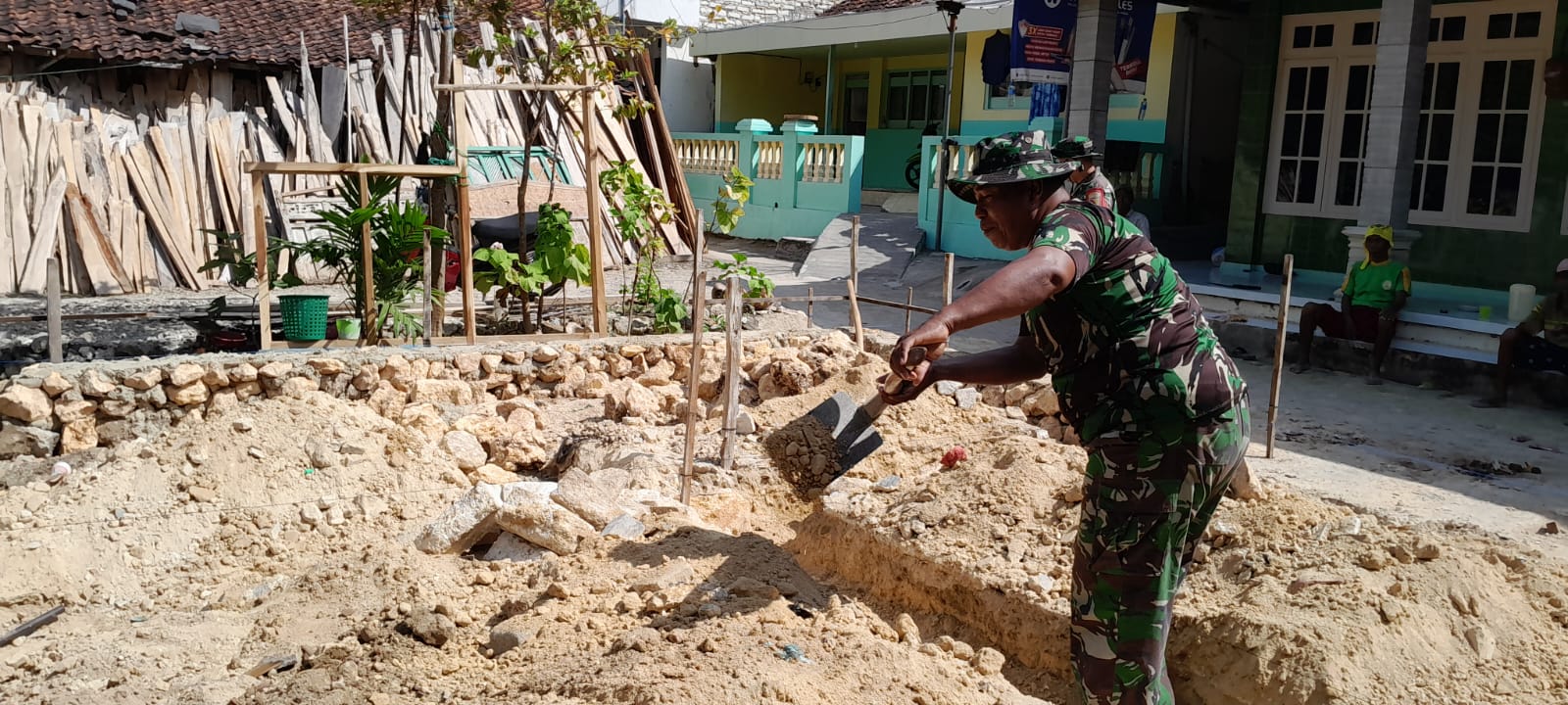SUMENEP — Sebagai bentuk kepedulian dan wujud nyata kemanunggalan TNI dengan rakyat, Babinsa Koramil 09/Peragaan Kodim 0827/Sumenep, Sertu Moh. Hasyim, turun langsung membantu warga membangun pondasi rumah di wilayah binaannya di Desa Pakamban Laok, Kecamatan Peragaan, Kabupaten Sumenep. Senin (30/06/2025).