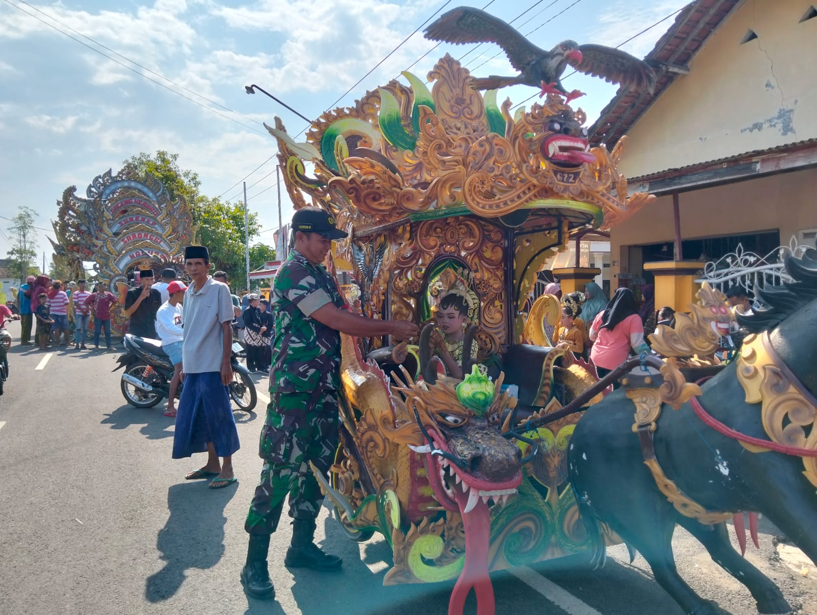 SUMENEP – Babinsa Koramil 0827/06 Saronggi, Sertu Masyono, melaksanakan tugas pengamanan rute pawai (karnaval) dalam rangkaian acara “Lekang Karatama” yang digelar oleh SDN Saronggi 1, Desa Saronggi, Kecamatan Saronggi, Kabupaten Sumenep, Senin (16/6/2025) sore.