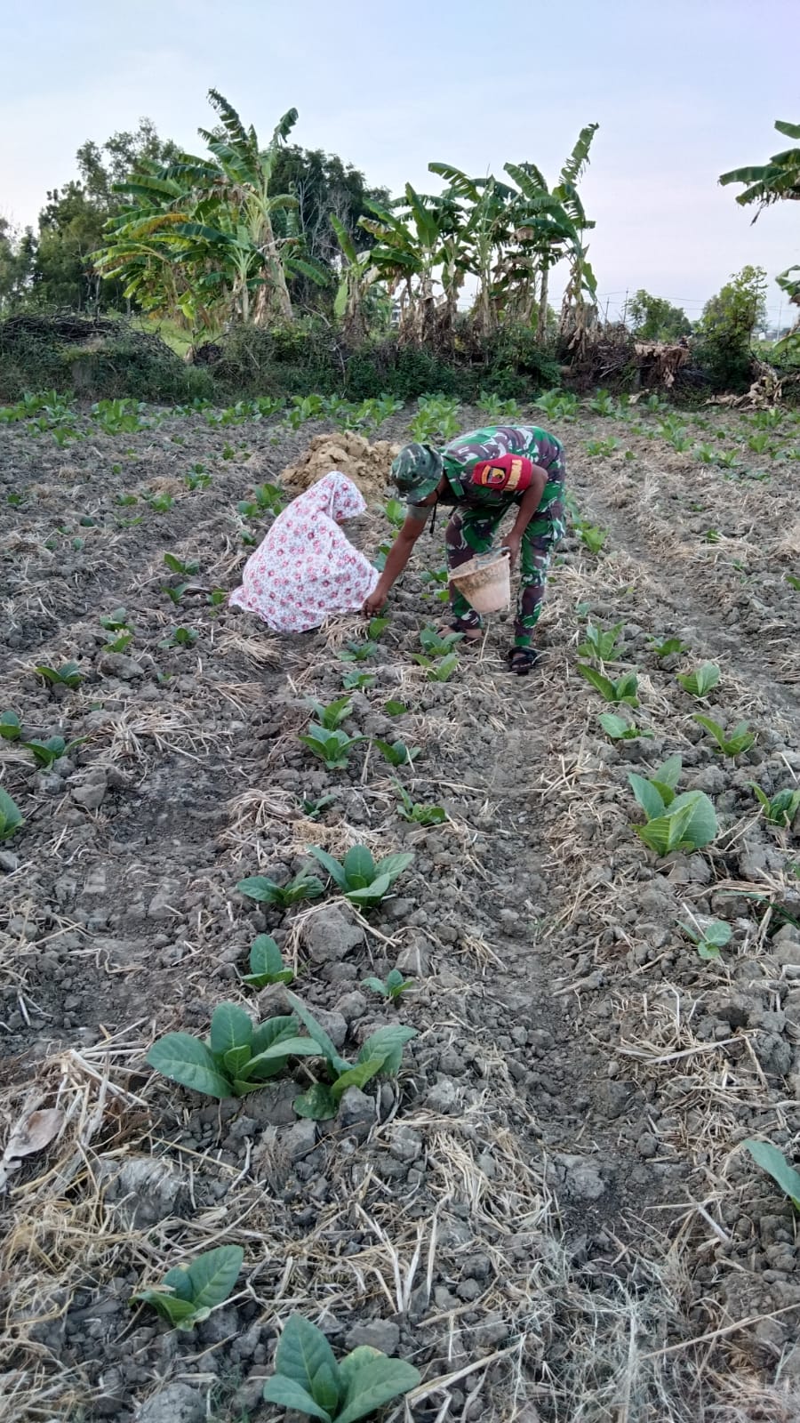 Kegiatan pendampingan ini dilakukan guna memastikan pertumbuhan tanaman tembakau tetap optimal. Babinsa bersama petani melakukan pengecekan kondisi tanaman, membersihkan gulma, serta memberikan saran terkait pemeliharaan dan pencegahan hama.