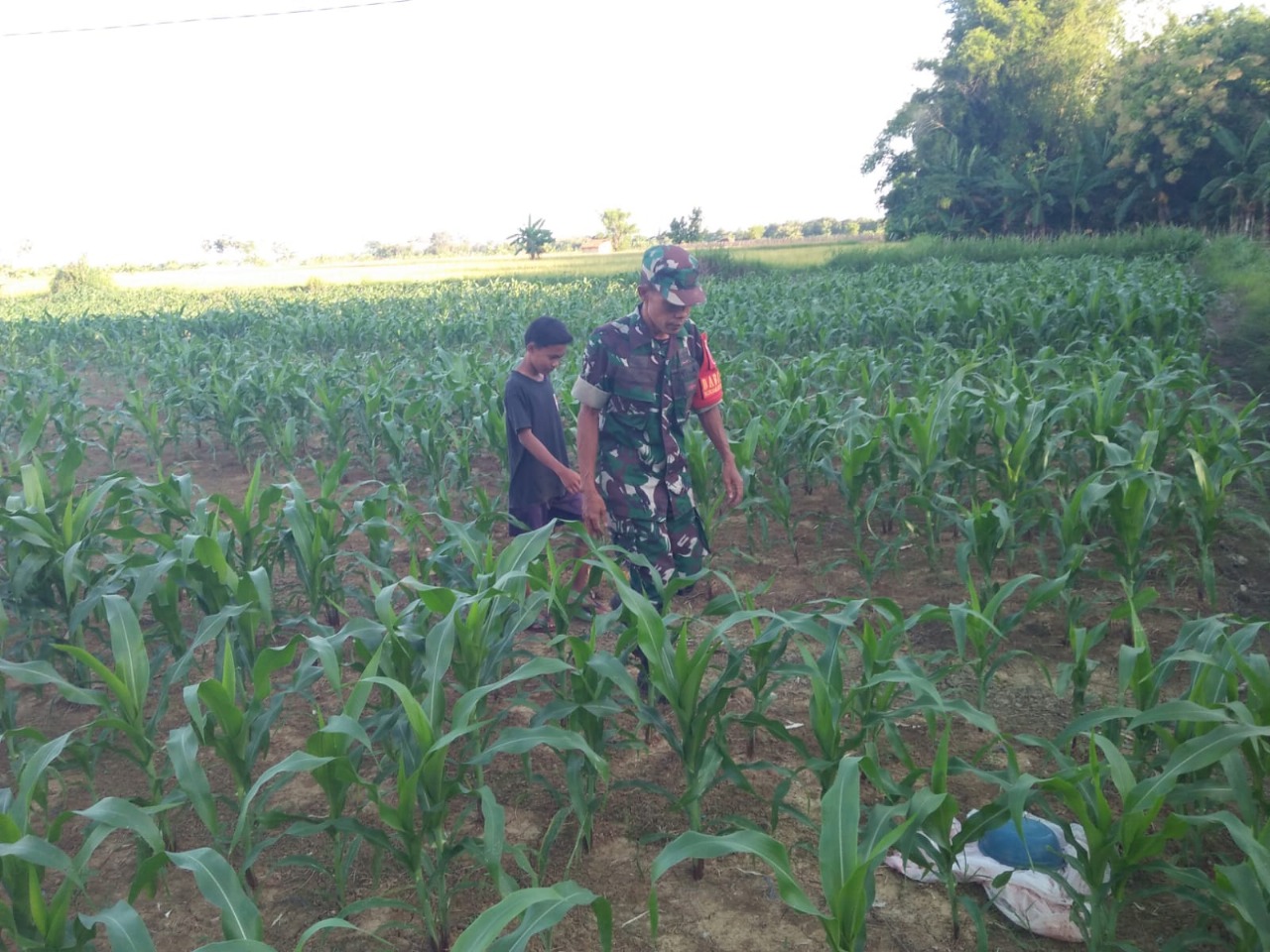 Pendampingan ini dilakukan dengan turun langsung ke lahan pertanian guna memantau perkembangan tanaman jagung milik petani setempat. Serka M. Rasul bersama beberapa petani tampak menyusuri area sawah dan kebun untuk mengecek kondisi tanaman, termasuk kesuburan tanah dan potensi serangan hama.