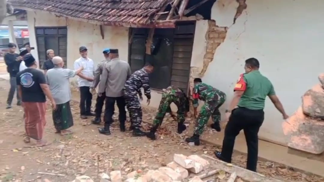Serka Jaelani yang hadir bersama anggota TNI dan masyarakat setempat ikut membantu membersihkan puing-puing reruntuhan.