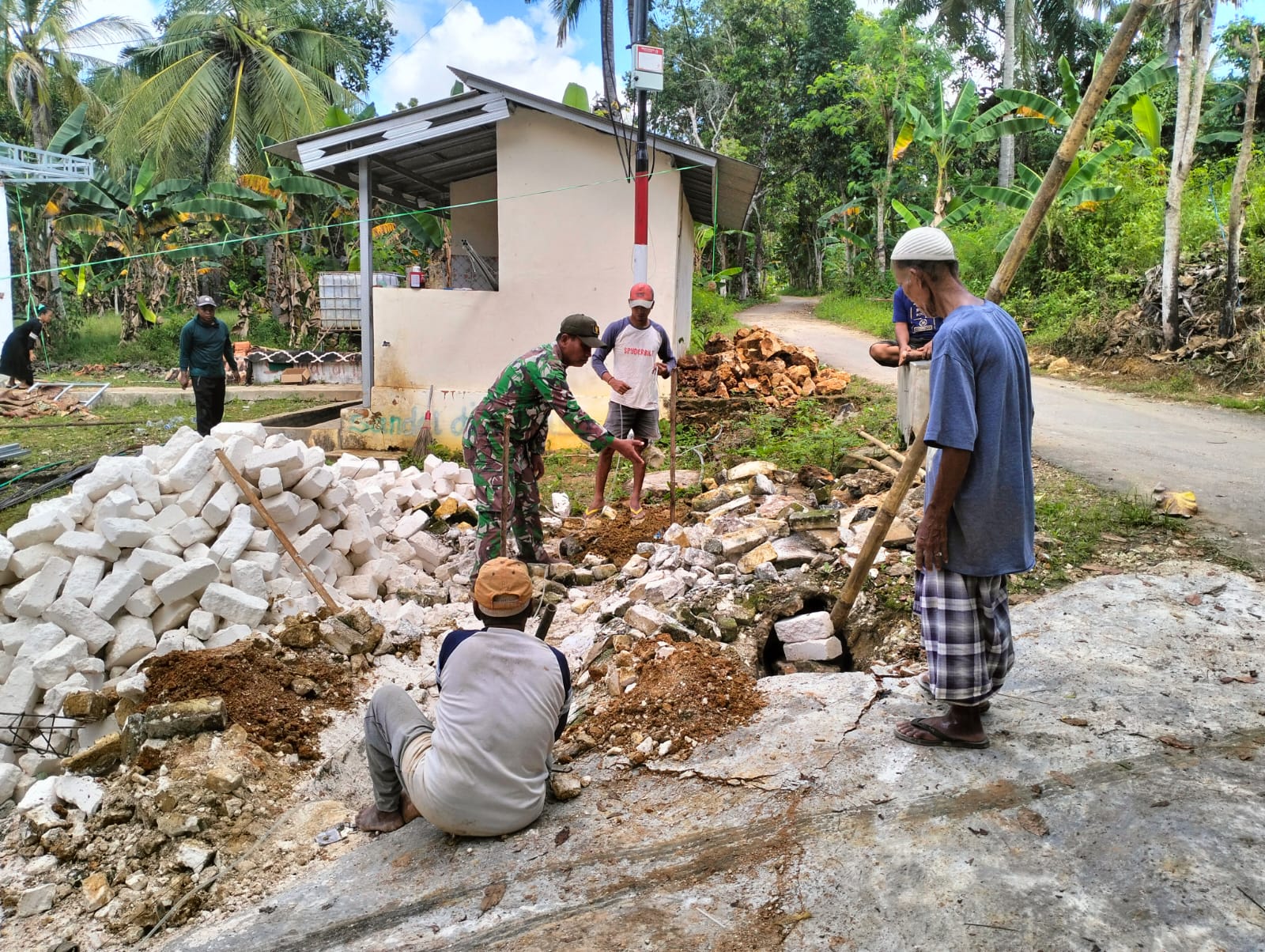 SUMENEP – Disela waktu dinas Babinsa Koramil 14/Batang Batang Kodim 0827/Sumenep Serma Tarom menyempatkan diri melaksanakan kerja bakti membantu warga membangun rumah di Desa Nyabakan Barat Kecamatan Batang Batang Kabupaten Sumenep, Selasa (6/5/2025).