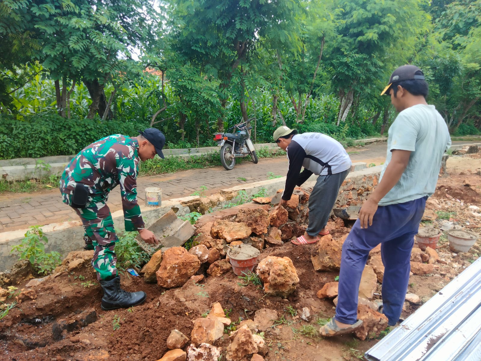 SUMENEP – Sejumlah warga bersama Babinsa Koramil 20/Sapudi Kodim 0827/Sumenep Sertu Agus Salim gotong royong membangun pagar rumah warga binaan di Desa Nyamplong Kecamatan Sapudi Kabupaten Sumenep, Selasa (24/6/2025).
