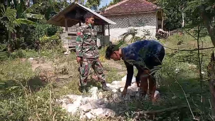 SUMENEP – Wujud kepedulian terhadap masyarakat di wilayah teritorial, Koptu Agus Rustanto Babinsa Koramil 12/Dasuk Kodim 0827/Sumenep melaksanakan giat kerja bakti membantu ambil bata putih untuk pembangunan rumah milik warga binaan di Desa Batu Belah Timur Kecamatan Dasuk Kabupaten Sumenep, Jumat (10/10/2025).