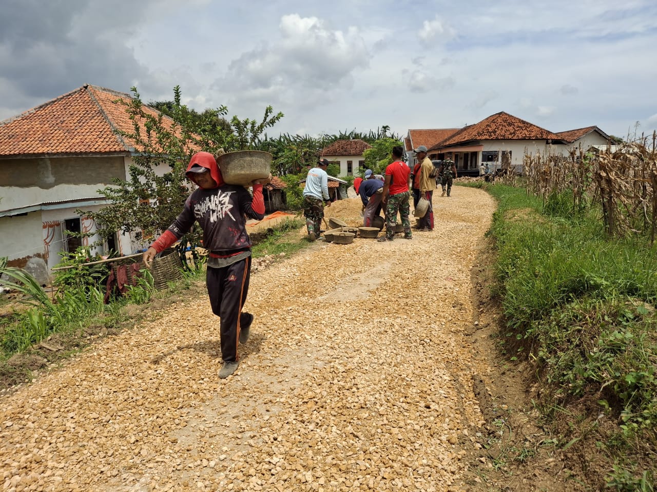 Batu koral tersebut diratakan secara manual agar membentuk dasar jalan yang kuat. Setelah itu, pekerjaan dilanjutkan dengan penyiraman aspal untuk mengikat material sehingga membentuk permukaan jalan yang lebih padat dan tahan lama.