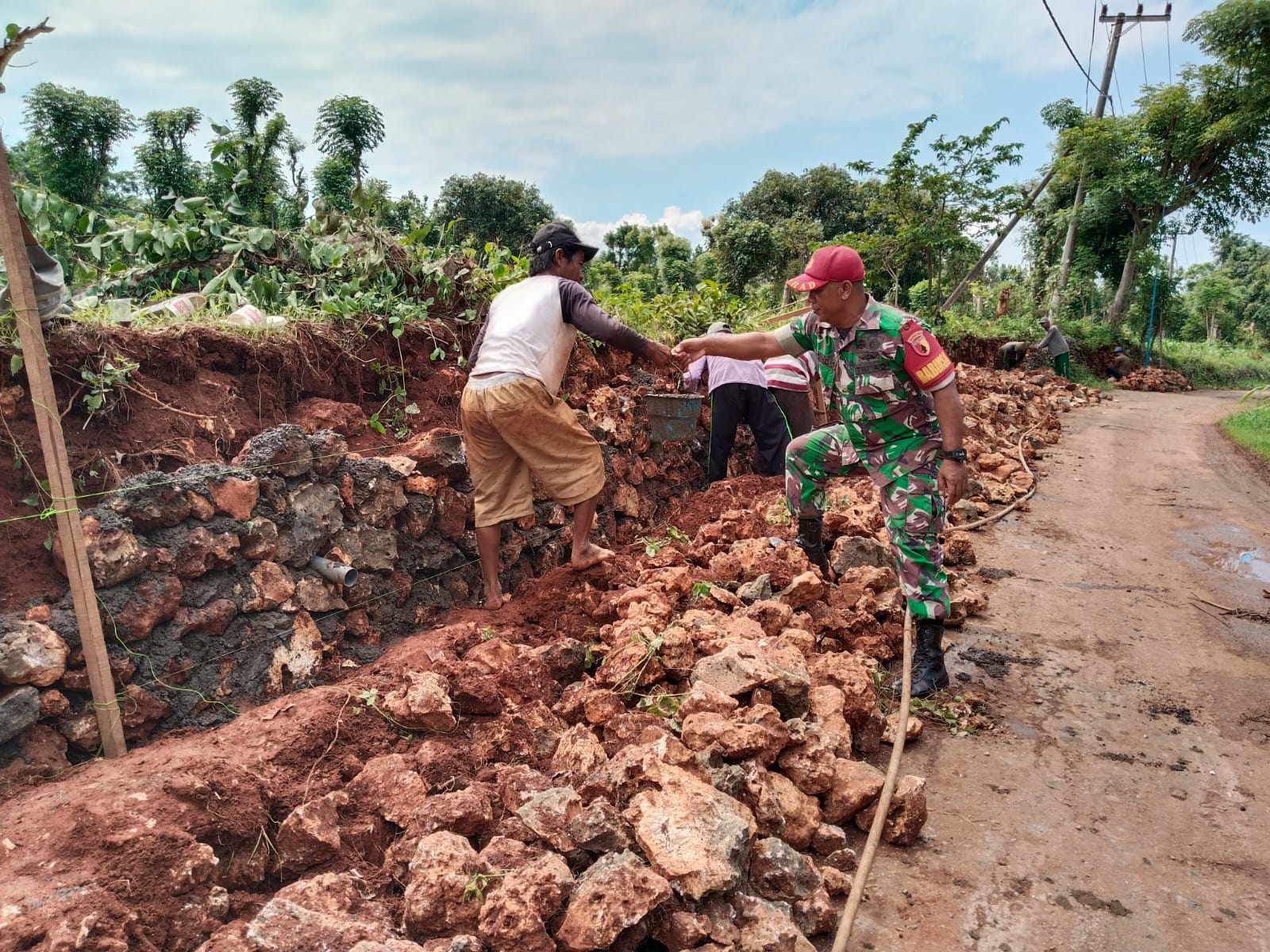 Sumenep – Mengantisipasi potensi bencana saat musim hujan, warga Desa Masaran, Kecamatan Bluto, Kabupaten Sumenep, bergotong royong bersama Babinsa Koramil 0827/04 Bluto, Serda Joko, membangun tembok penahan tanah (TPT).