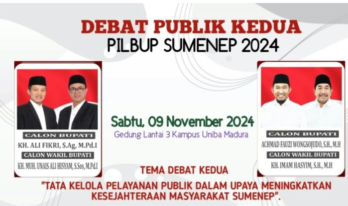 Pada debat kedua Pilkada 2024 Bertempat di Gedung Uniba Madura Lantai III, akan Mengusung tema debat ‘Tata kelola pelayanan publik dalam upaya meningkatkan kesejahteraan masyarakat Sumenep.