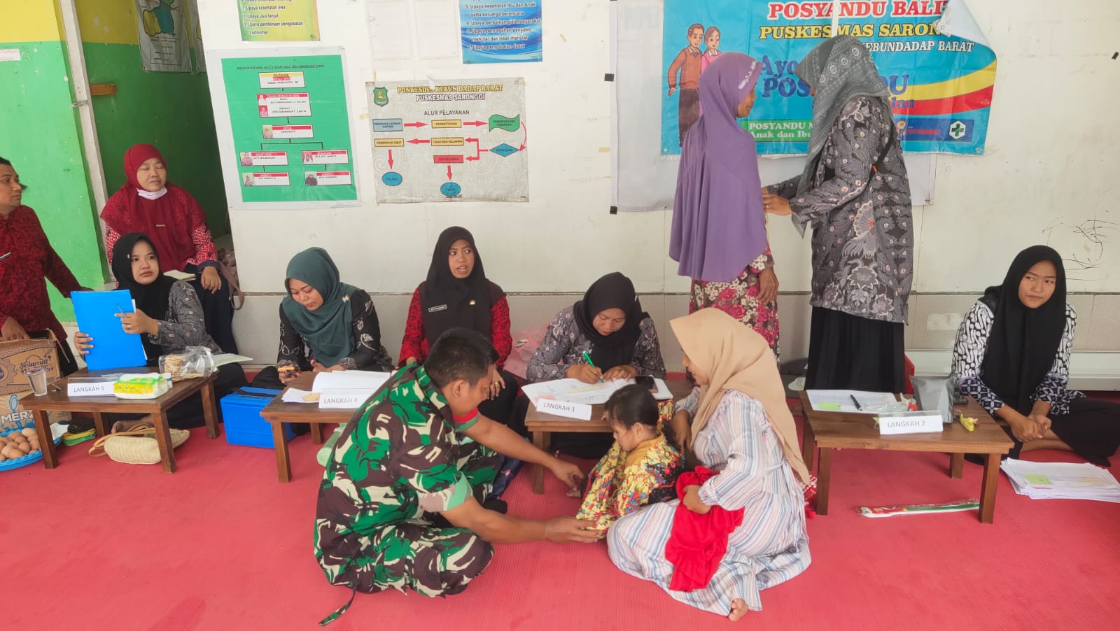 Hadir mendampingi warga dalam pelayanan kesehatan bertujuan untuk membantu kelancaran serta tertibnya kegiatan, Serda Jusa mengatakan “untuk menuju percepatan stunting di wilayah, kegiatan Posyandu perlu adanya dukungan penuh dari masyarakat, ujarnya.
