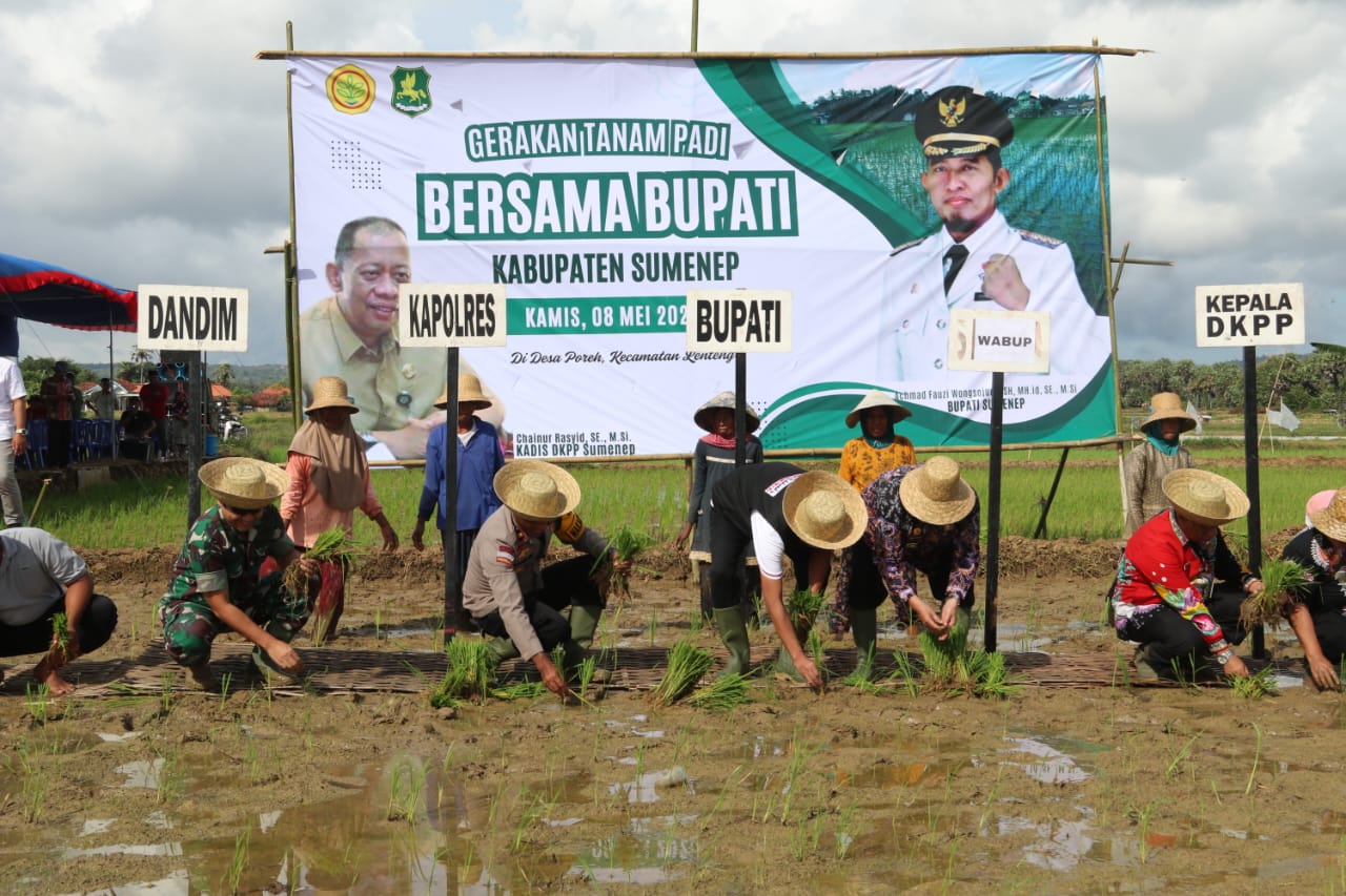 SUMENEP – Dandim 0827/Sumenep Letkol Inf Yoyok Wahyudi, S.I.P.,M.Han turun ke sawah melakukan gerakan tanam padi masa tanam kedua bersama Bupati Sumenep Achmad Fauzi Wongsojudo, S.H.,M.H.