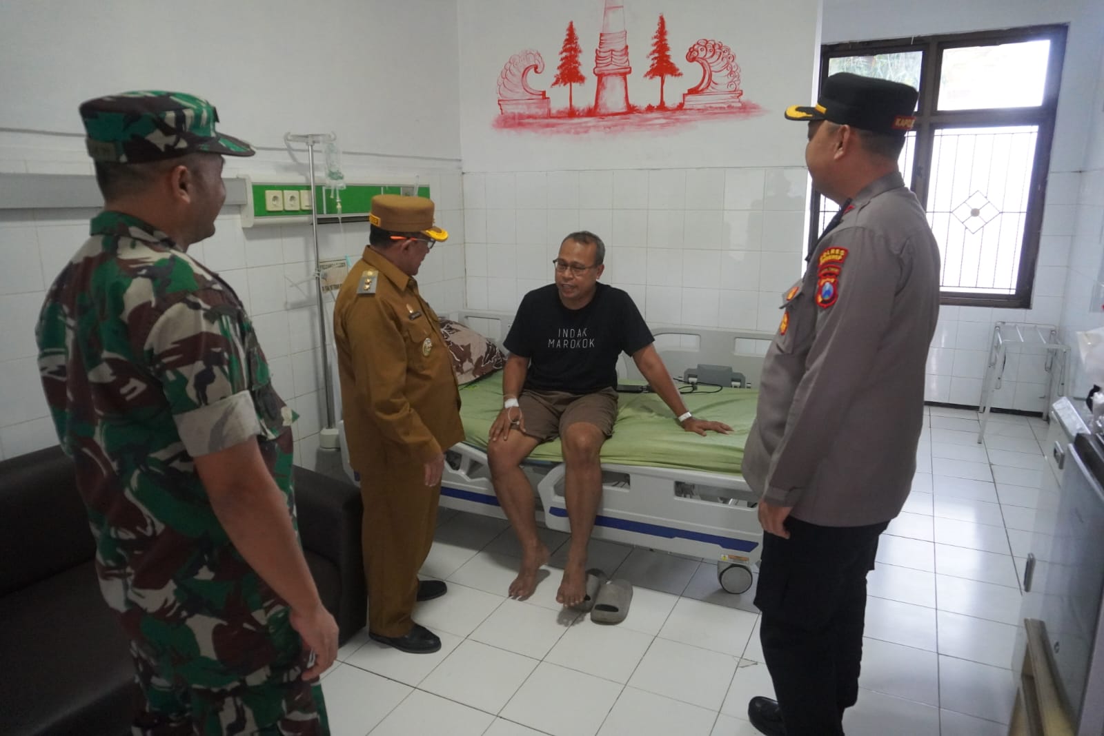 SUMENEP – Komandan Kodim (Dandim) 0827/Sumenep Letkol Inf Yoyok Wahyudi, S.I.P.,M.Han bersama Forkopimda Kabupaten Sumenep menjenguk Kepala Kejaksaan Negeri (Kajari) Sumenep, Sigit Waseso, S.H., M.H., yang sedang menjalani perawatan di RSUD dr. H. Moh. Anwar Sumenep, Selasa (27/5/2025).