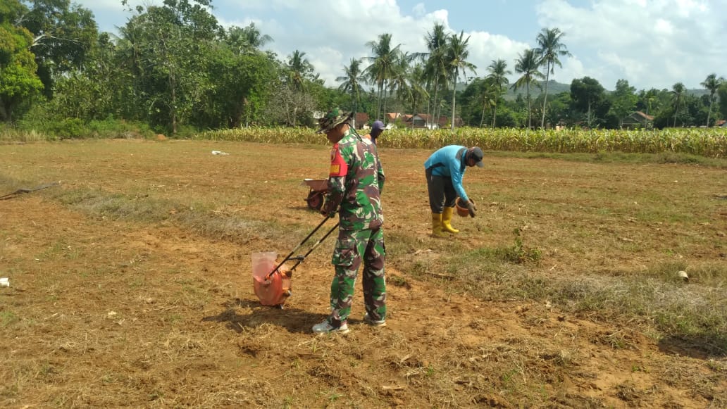 Sumenep – Dalam upaya mendukung ketahanan dan swasembada pangan nasional, Babinsa Koramil 0827/Lenteng Koptu Agus Roni bersama warga melaksanakan gerakan tanam jagung jenis hibrida di lahan seluas 1,5 hektare milik Bapak Busri, warga Dusun Bates Timur, Desa Ellak Daya, Kecamatan Lenteng, Kabupaten Sumenep, Sabtu (18/10/2025).