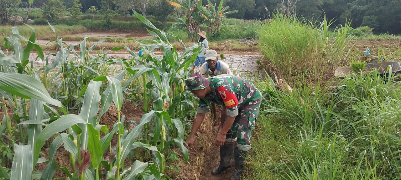 SUMENEP — Dalam rangka mendukung ketahanan pangan di wilayah binaannya, Babinsa Koramil 13/Rubaru Sertu Hari turun langsung ke lahan pertanian untuk membantu petani merawat tanaman jagung di Desa Karang Nangka, Kecamatan Rubaru, Kabupaten Sumenep, Rabu (23/7/2025).
