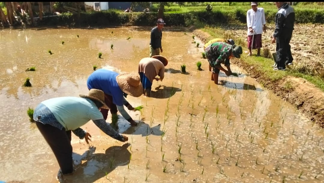 SUMENEP – Bintara Pembina Desa atau Babinsa Koramil 12/Dasuk, Kodim 0827/Sumenep Serda Antok menunjukkan kepeduliannya terhadap kesejahteraan para petani dengan turun langsung ke sawah membantu proses pencabutan bibit padi dan penanaman padi.