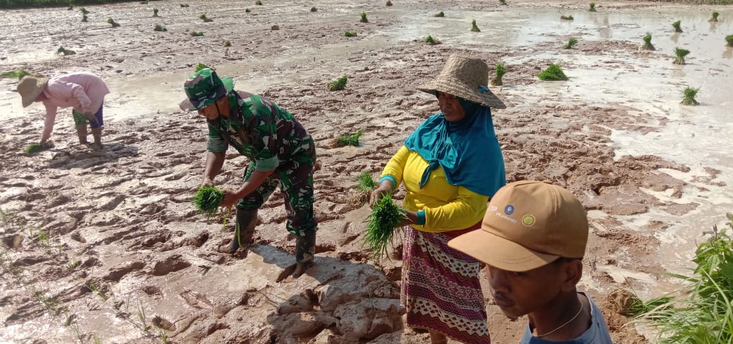 SUMENEP – Bintara Pembina Desa atau Babinsa Koramil 13/Rubaru, Kodim 0827/Sumenep Serma Kusfandi menunjukkan kepeduliannya terhadap kesejahteraan para petani dengan turun langsung ke sawah membantu proses pencabutan bibit padi dan penanaman padi.