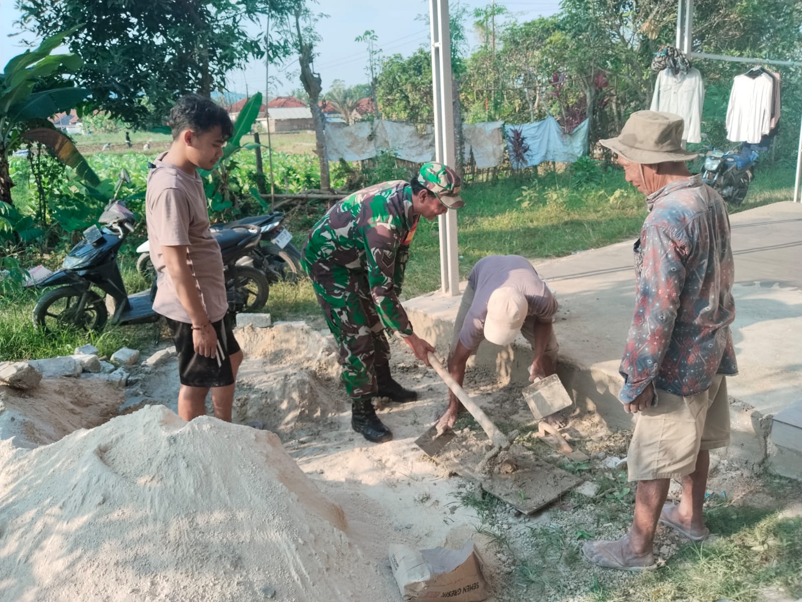 Sumenep – Dalam rangka meningkatkan kebersamaan dan solidaritas antara TNI-AD dan masyarakat, Babinsa Koramil 07/Guluk guluk Serka Gatot melaksanakan gotong royong bersama warga mengaduk campuran semen dan pasir di Desa Payudan Daleman Kecamatan Guluk guluk Kabupaten Sumenep, Kamis (23/10/2025).