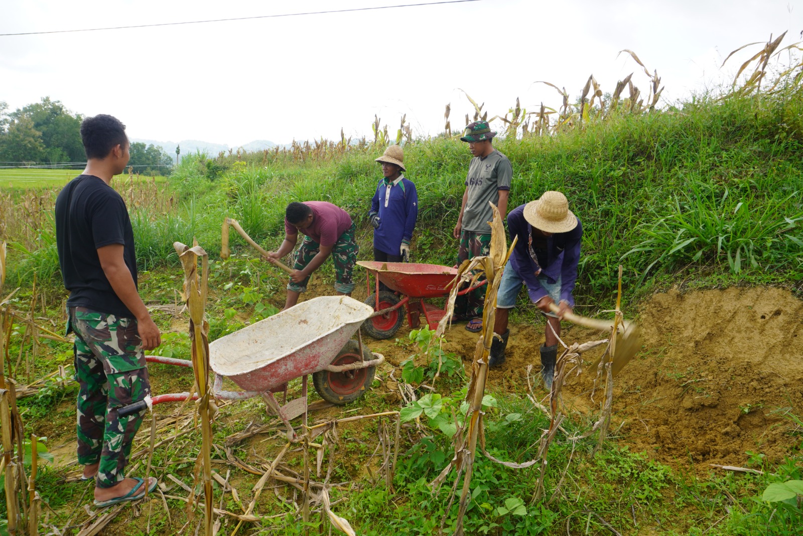 Dalam pelaksanaan pembangunan tersebut, personel Satgas TMMD bersama warga setempat bergotong royong menggunakan argo (alat angkut sederhana) untuk mengangkat dan memindahkan timbunan tanah sebagai bagian dari proses penyiapan pondasi rumah.