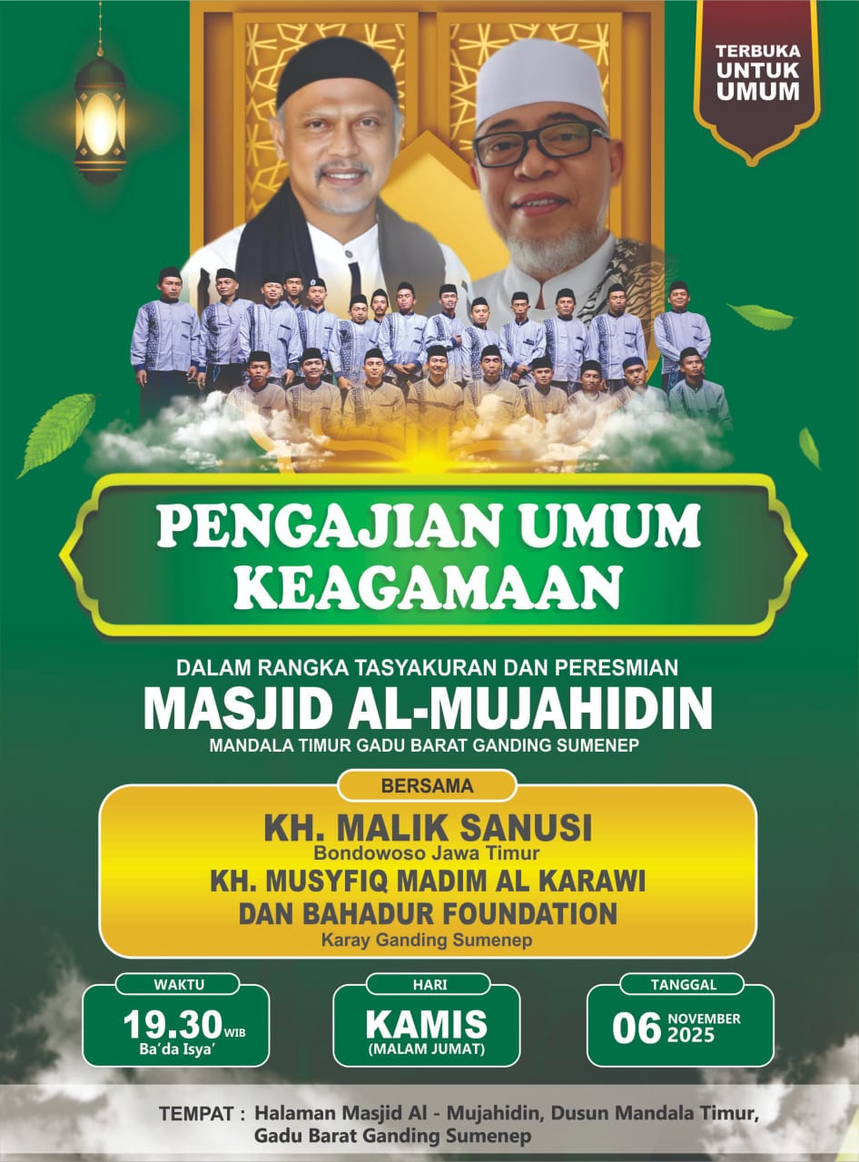 “Kami mengundang seluruh warga Ganding dan sekitarnya untuk hadir bersama keluarga. Mari kita isi malam Jumat dengan dzikir, doa, dan tausiah sebagai wujud rasa syukur atas berdirinya Masjid Al-Mujahidin ini,” tambahnya.