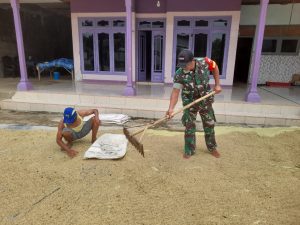Terlihat Babinsa bersama petani menebar gabah di atas terpal agar cepat kering.