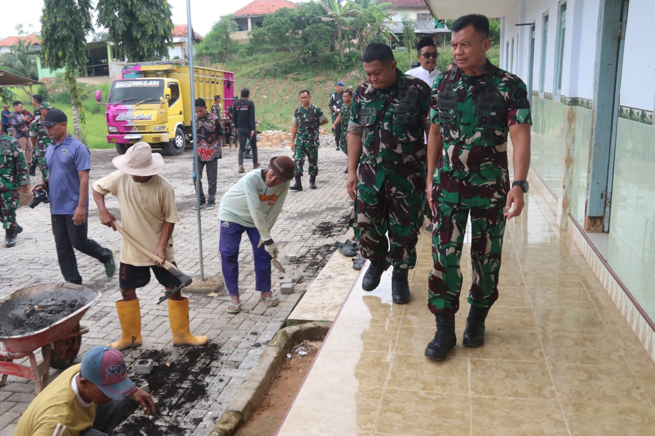 Kasdam meninjau progres pembangunan tembok penahan tanah (plengsengan) serta paving block di Ponpes Miftahul Ulum yang dikerjakan bersama Satgas TMMD dan warga.