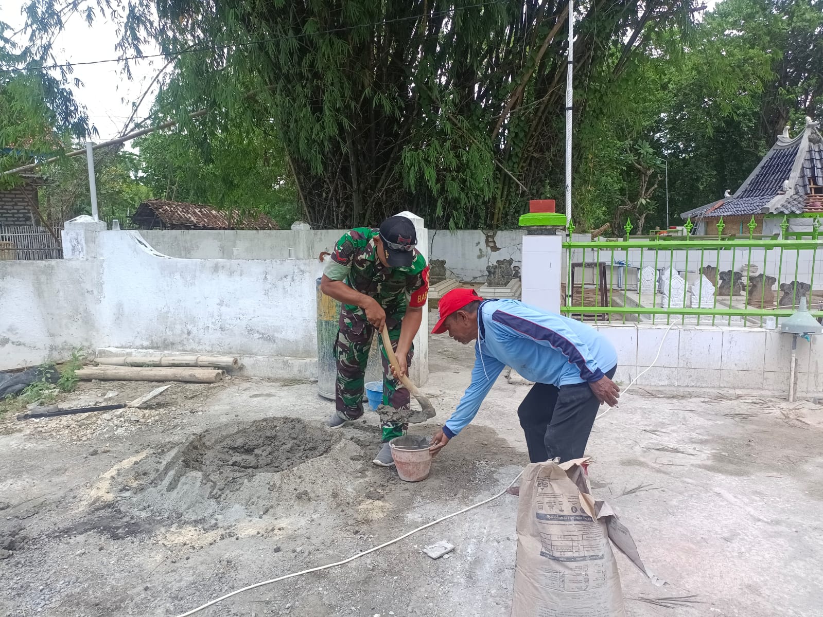 Sumenep, Jatim | suaranasionalnews.co.id ∼ Babinsa Desa Langsar Koramil 06/Saronggi Kodim 0827/Sumenep Koptu Sugiyanto melaksanakan karya Bakti (karbak) bantu warga mengaduk campuran semen dan pasir di Desa Langsar Kecamatan Saronggi Kabupaten Sumenep, Jumat (21/3/2025).